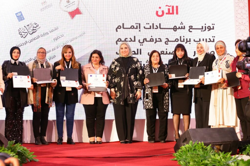 وسلمت القباج عددا من الشهادات لمتدربي برنامج “حرفي” لدعم صغار ومصنعي الحرف اليدوية والتراثية والذي تنفذه وزارة التضامن الاجتماعي بالتعاون مع البنك المركزي المصري.