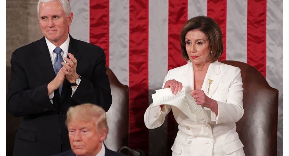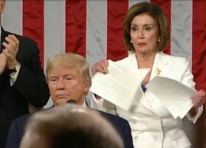 حدث ذلك قبل أن يلقي ترامب خطابه، في حين ردت رئيسة مجلس النواب بيلوسى بعد انتهائه بتمزيق نسخة من خطابه ورقة وراء أخرى، تم ألقت بها جانبا.