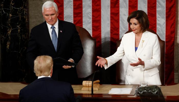 في لفتة ذات دلالات واضحة ، امتنع الرئيس الأمريكى دونالد ترامب عن مصافحة نانسى بيلوسى رئيسة مجلس النواب وتجاهل يدها الممدودة بعد أن سلمها نسخة من خطابه عن حالة الاتحاد.