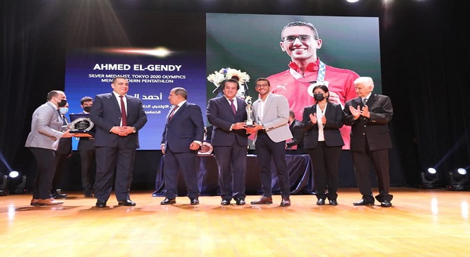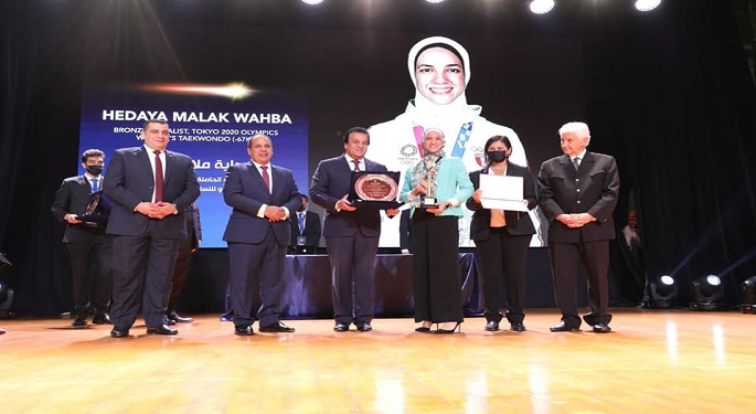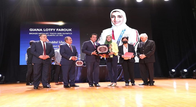 وقد شهدت الاحتفالية تكريم الأبطال الستة، الحاصلين على ميداليات بطوكيو، ومنهم: ابنة الجامعة البريطانية، فريال أشرف الحاصلة على الميدالية الذهبية المصرية الوحيدة بالأولمبياد، والتي ألقت كلمةَ المُكرمين بالاحتفالية، وكذلك أحمد الجندي الحاصل على فضية الخماسي الحديث، كأول مصري يحقق ميدالية في هذه الرياضة، وسيف عيسى بطل التايكوندو والحاصل على الميدالية البرونزية، ومحمد إبراهيم كيشو بطل المصارعة الرومانية والحاصل على برونزية وزن 68 كجم، وكذلك اللاعبة هداية ملاك لاعبة التايكوندو الحاصلة على الميدالية البرونزية للمرة الثانية بعدما حصلت على نفس الميدالية في دورة “ريو دي جانيرو 2016″، واللاعبة جيانا فاروق الحاصلة على الميدالية البرونزية في منافسات الكاراتيه.