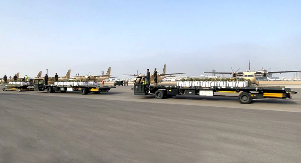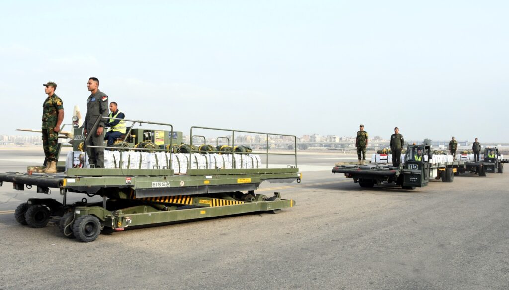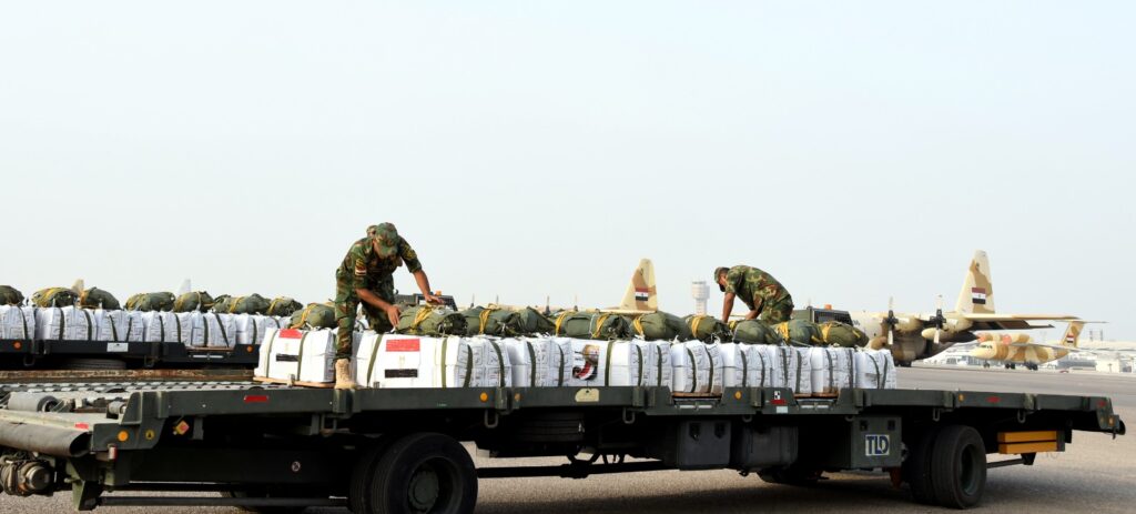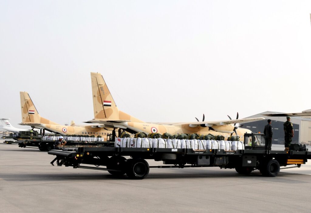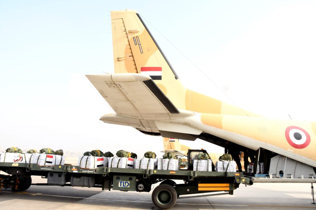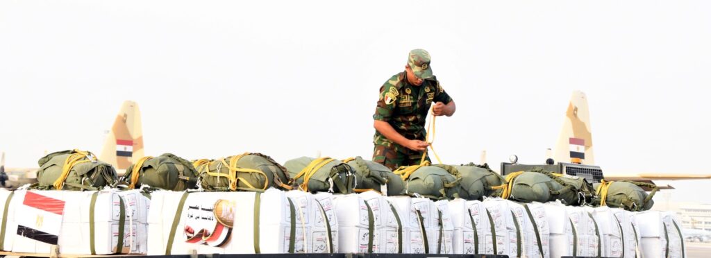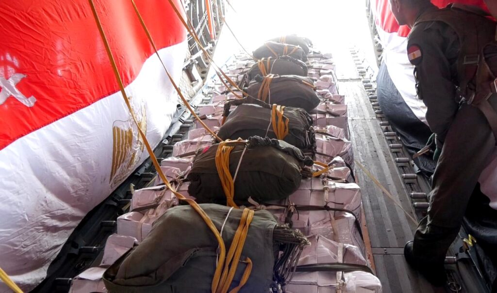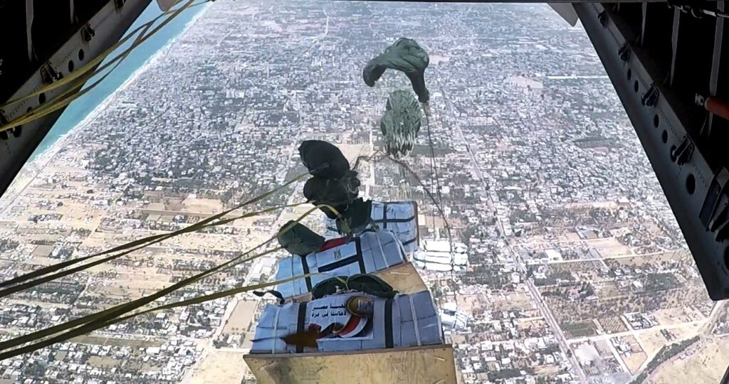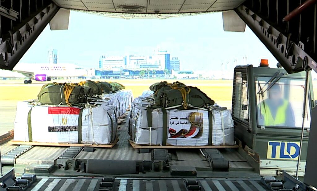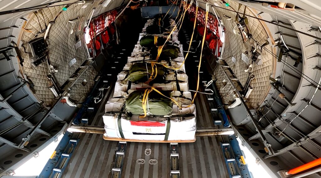وفى إطار الجهود المصرية الفاعلة والمساعى المكثفة بالتنسيق مع كافة الأطراف والقوى الدولية لمحاولة إنهاء تفاقم الأوضاع المأساوية التى يعانى منها الأشقاء الفلسطينيين بقطاع غزة خلال الآونة الأخيرة؛ أقلعت 4 طائرات نقل عسكرية من جمهورية مصر العربية محملة بأطنان من المساعدات الغذائية لتنفيذ أعمال الإسقاط الجوى على المناطق التى يصعب الوصول إليها براً بقطاع غزة، وذلك لتخفيف حدة الأوضاع المعيشية الصعبة ونقص الاحتياجات الإنسانية التى يعانى منها سكان القطاع، هذا بالتزامن مع إستمرار تقديم المساعدات براً.