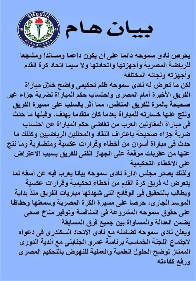 بالصور .. سموحة يتضامن مع الاتحاد ويطالب باجتماع لبحث النهوض بالتحكيم