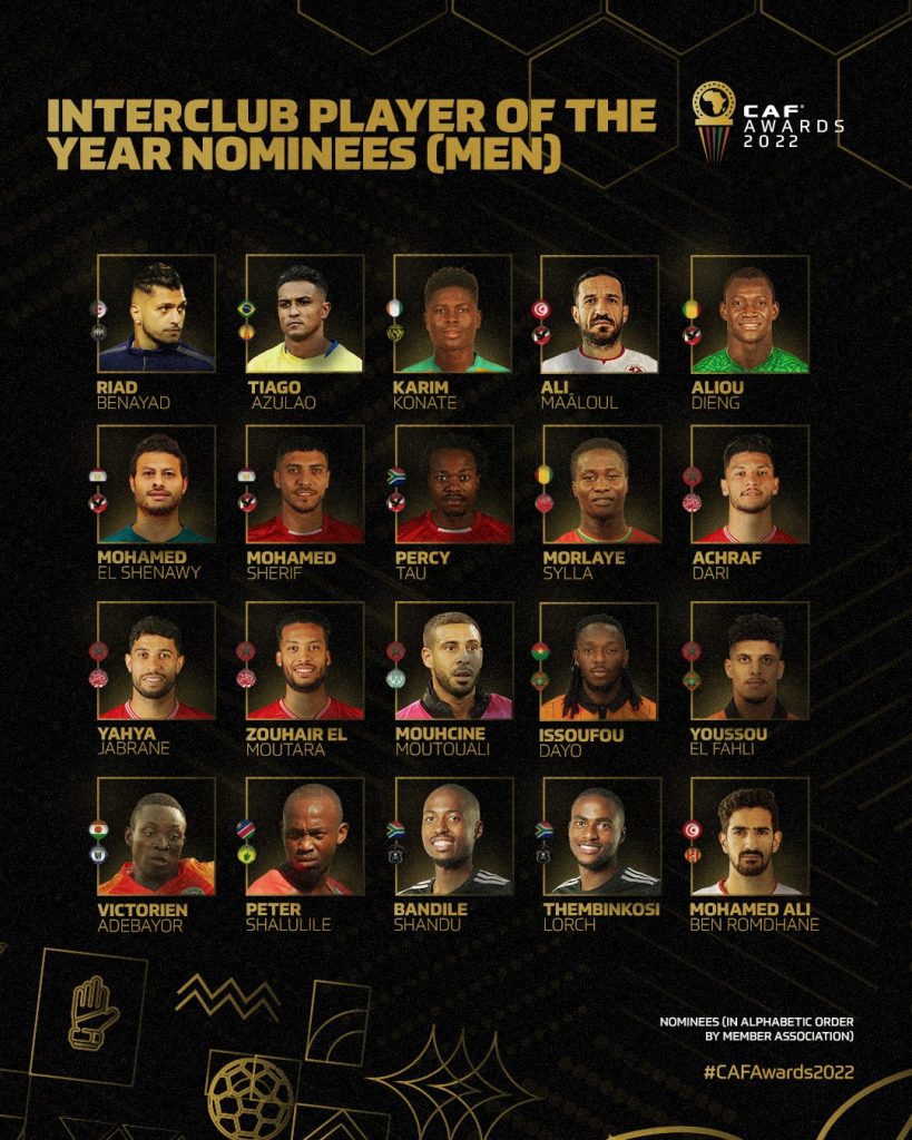 وجاءت أسماء المرشحين لجوائز أفضل لاعب في إفريقيا كالتالي، رياض محرز (الجزائر ومانشستر سيتي)، وبرتراند تراوري (بوركينا فاسو وأستون فيلا)، وبلاتي توري (بوركينا فاسو وبيراميدز)، وإدموند تابسوبا (بوركينا فاسو وباير ليفركوزن)، وأنجويسا (الكاميرون ونابولي)، وكارل توكو (الكاميرون وليون)، وفنسنت أبو بكر (الكاميرون والنصر)، وفرانك كيسي (ساحل العاج وميلان)، سيباستيان هالر (ساحل العاج وأياكس)، ومحمد عبد المنعم (مصر والأهلي)، ومحمد النني (مصر وأرسنال)، ومحمد صلاح (مصر وليفربول)، ومحمد الشناوي (مصر والأهلي)، وموسى بارو (جامبيا وبولونيا)، ونابي كيتا (غينيا وليفربول)، وأليو ديانج (مالي والأهلي)