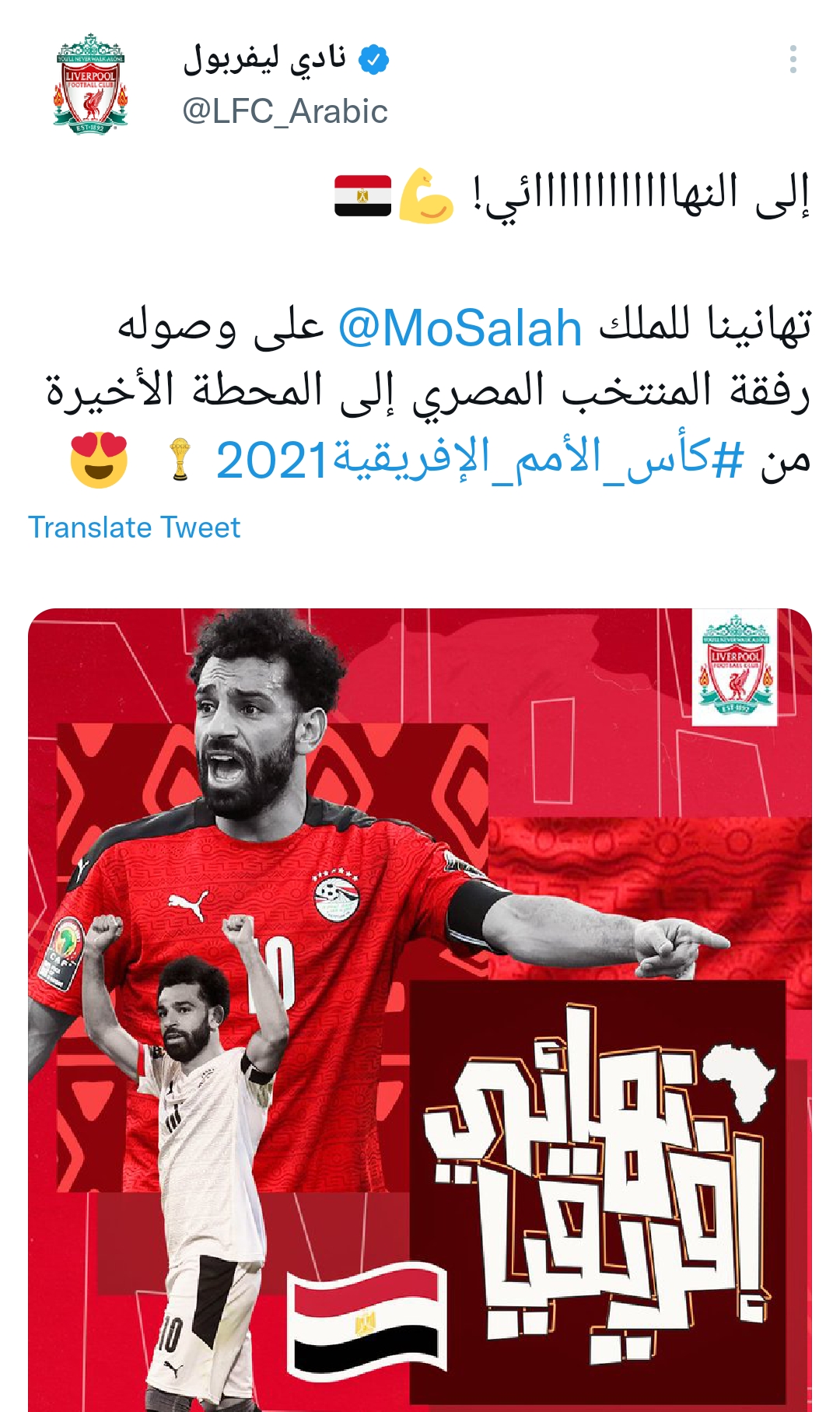 بالصور.. ليفربول يهنىء صلاح ومصر بالوصول الى نهائي الكان