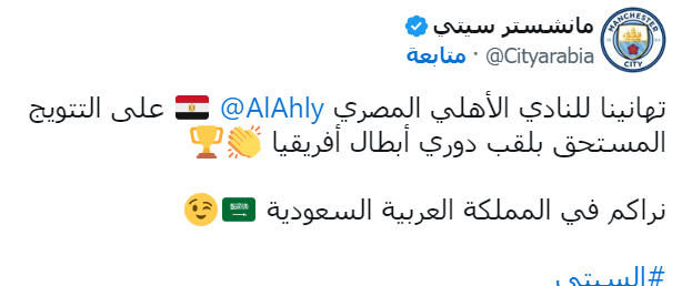 ونشر مانشستر سيتي تغريدة عبر حسابه باللغة العربية على موقع “تويتر” قال فيها: “تهانينا للنادي الأهلي المصري على التتويج المستحق بلقب دوري أبطال أفريقيا”.