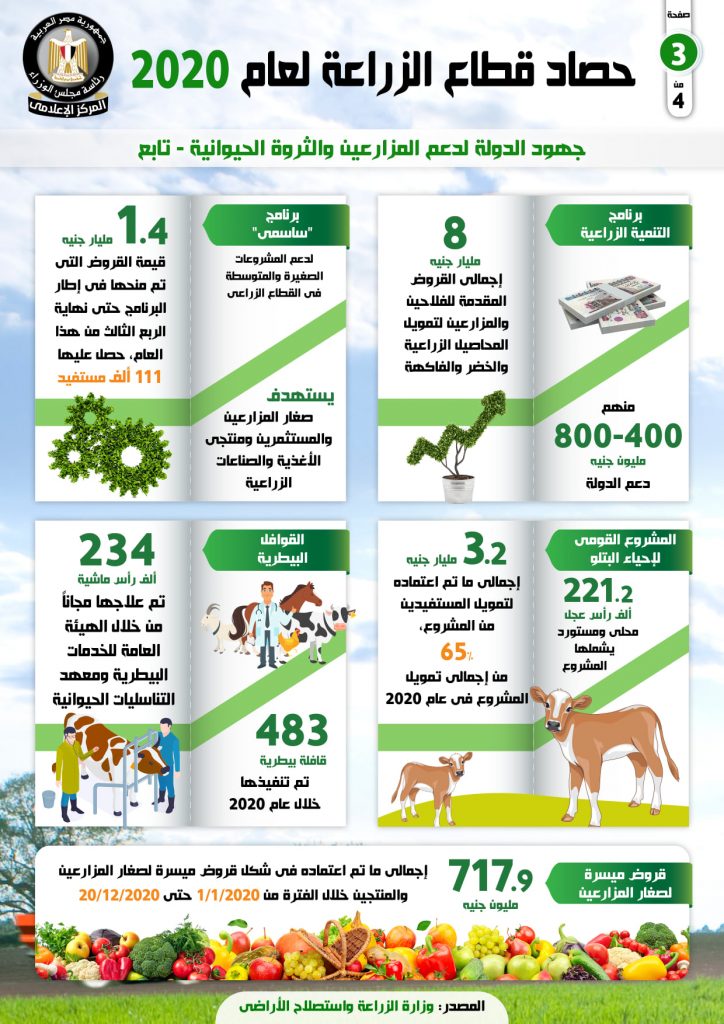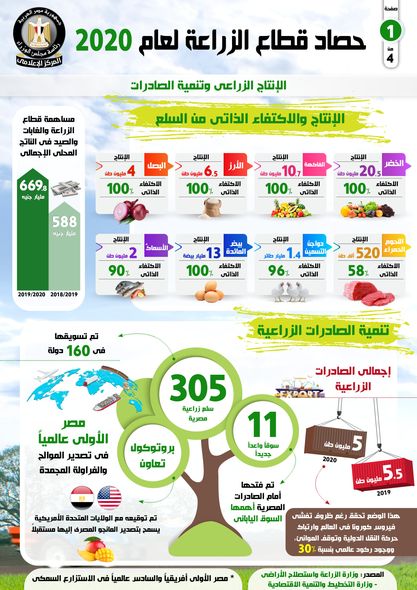 نشر المركز الإعلامي لمجلس الوزراء، تقريراً في هذا الخصوص، والذي تضمن إنفو جرافات تسلط الضوء على حصاد قطاع الزراعة خلال العام الجاري.