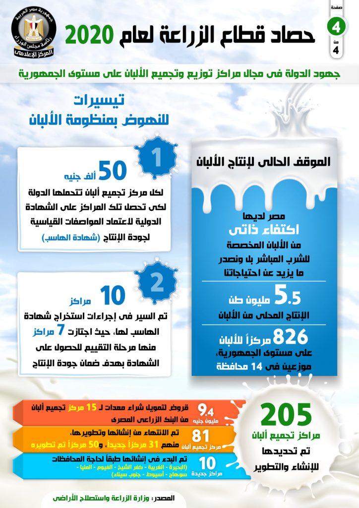 كما تم الانتهاء من إنشاء وتطوير 81 مركز تجميع ألبان منهم 31 مركزاً جديداً، و50 مركزاً تم تطويره، بالإضافة إلى أن هناك 10 مراكز جديدة تم البدء في إنشائها طبقاً لحاجة المحافظات (البحيرة- الغربية- كفر الشيخ- الفيوم- المنيا- سوهاج- أسيوط- جنوب سيناء).