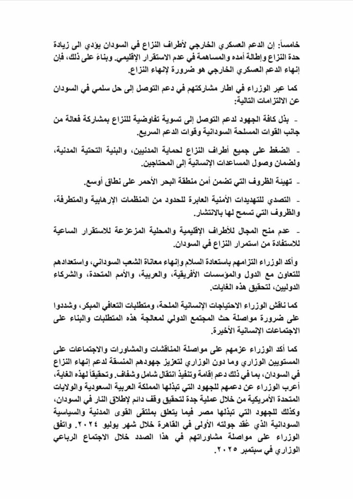 وقد أكد البيان على ضرورة الحفاظ على سيادة ووحدة السودان وسلامته الإقليمية كعناصر أساسية للأمن والاستقرار في السودان، وتكثيف المساعدات الإنسانية لجميع أبناء الشعب السوداني الشقيق، وإنهاء تدفقات السلاح التي تطيل من أمد النزاع.