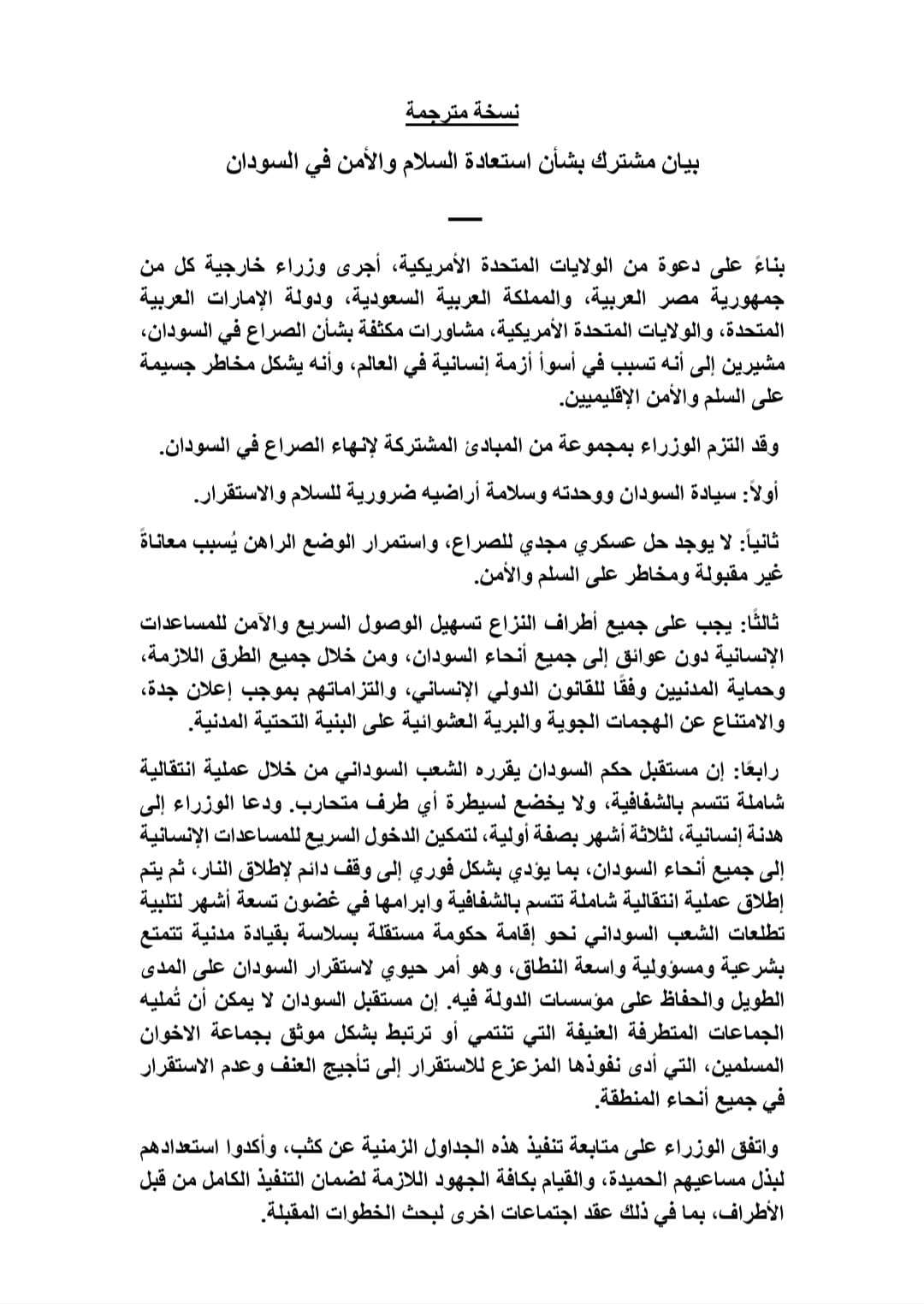 كما طالب البيان بهدنة إنسانية لمدة ثلاثة أشهر بصفة مبدئية، تقود إلى وقف دائم لإطلاق النار، ثم يقود ذلك إلى عملية انتقالية جامعة وشفافة خلال تسعة أشهر تحقق تطلعات الشعب السوداني نحو حكومة مدنية مستقلة، حيث اتفق وزراء خارجية الدول الأربعة على متابعة تنفيذ تلك الالتزامات وبذل مساعيهم الحميدة لضمان التنفيذ.