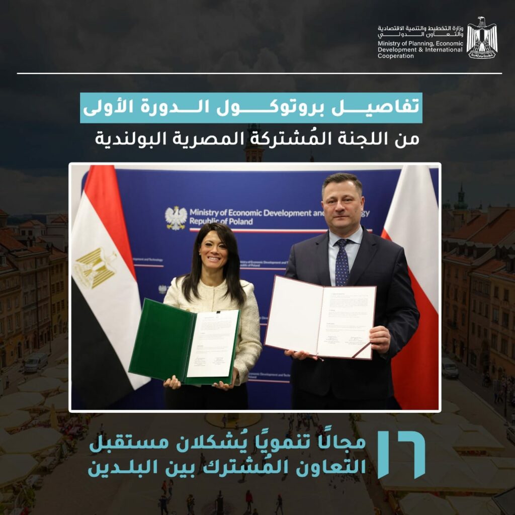 اختُتمت فعاليات الدورة الأولى من اللجنة المصرية البولندية المُشتركة لتعزيز التعاون الاقتصادي والعلمي والفني، برئاسة رانيا المشاط، وزيرة التخطيط والتنمية الاقتصادية والتعاون الدولي، ونظيرها البولندي، وذلك تنفيذًا لاتفاق التعاون الاقتصادي الذي تم توقيعه خلال زيارة الرئيس البولندي لمصر عام 2022.