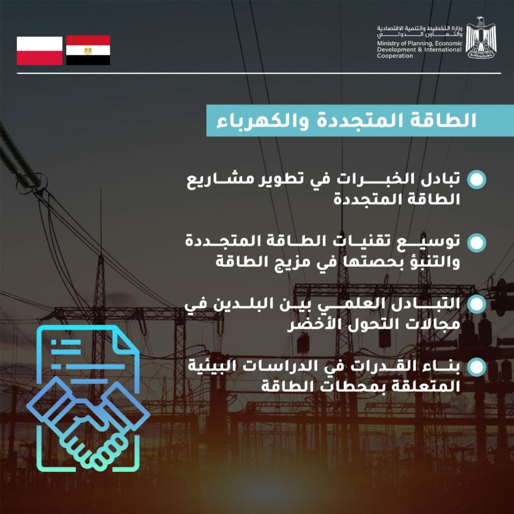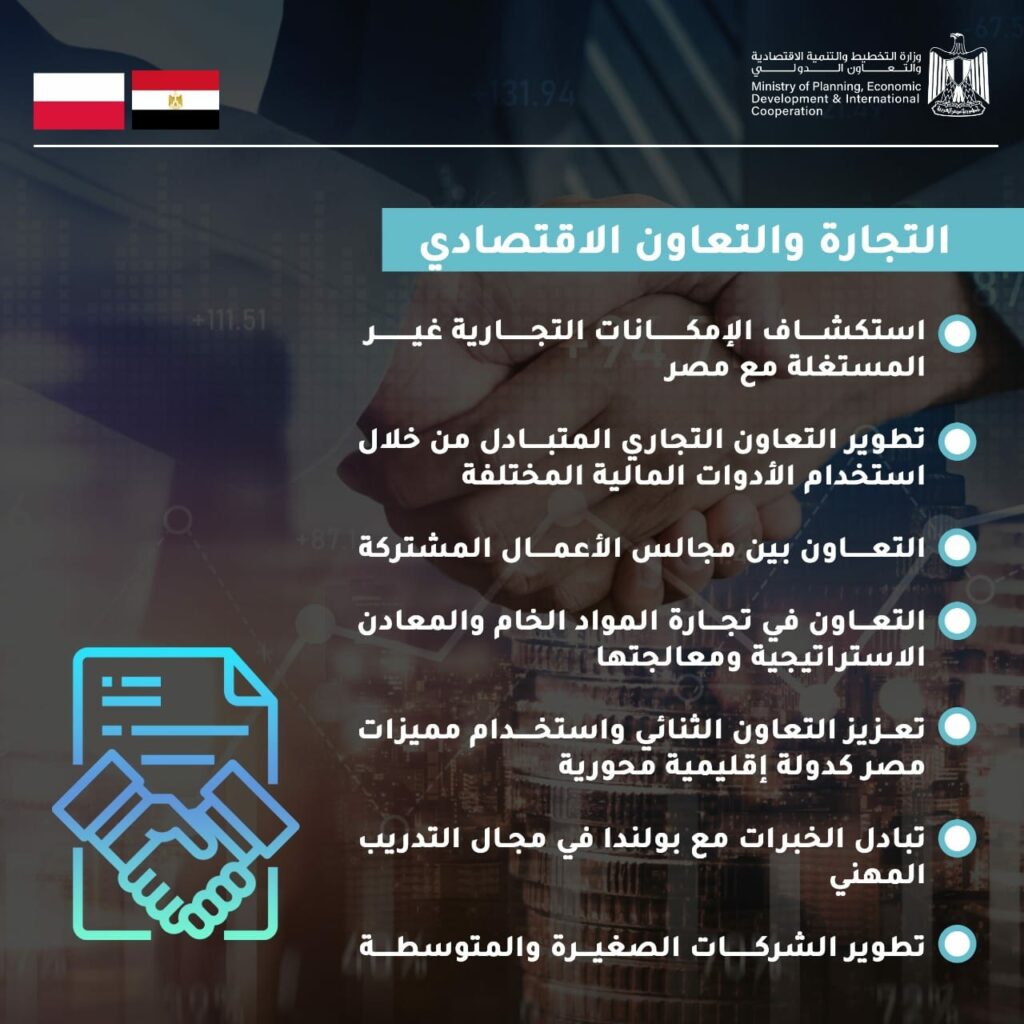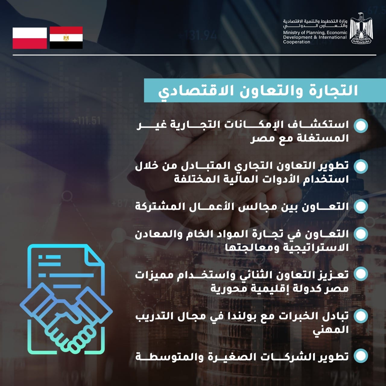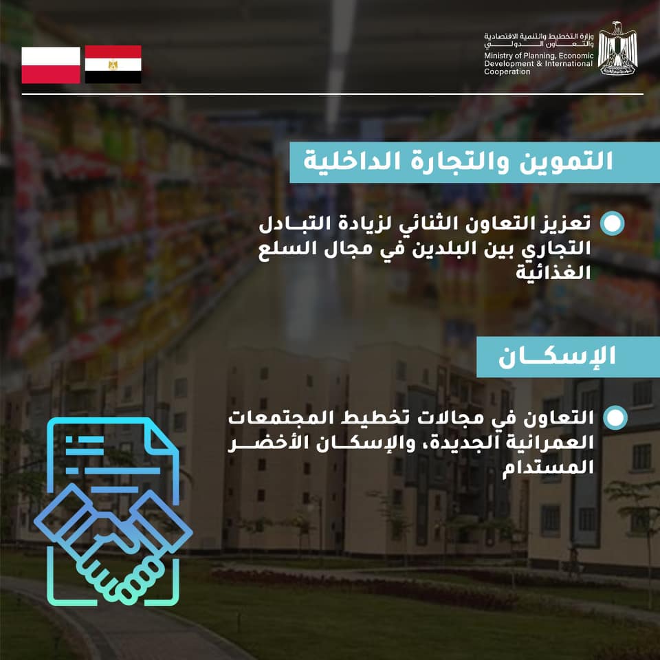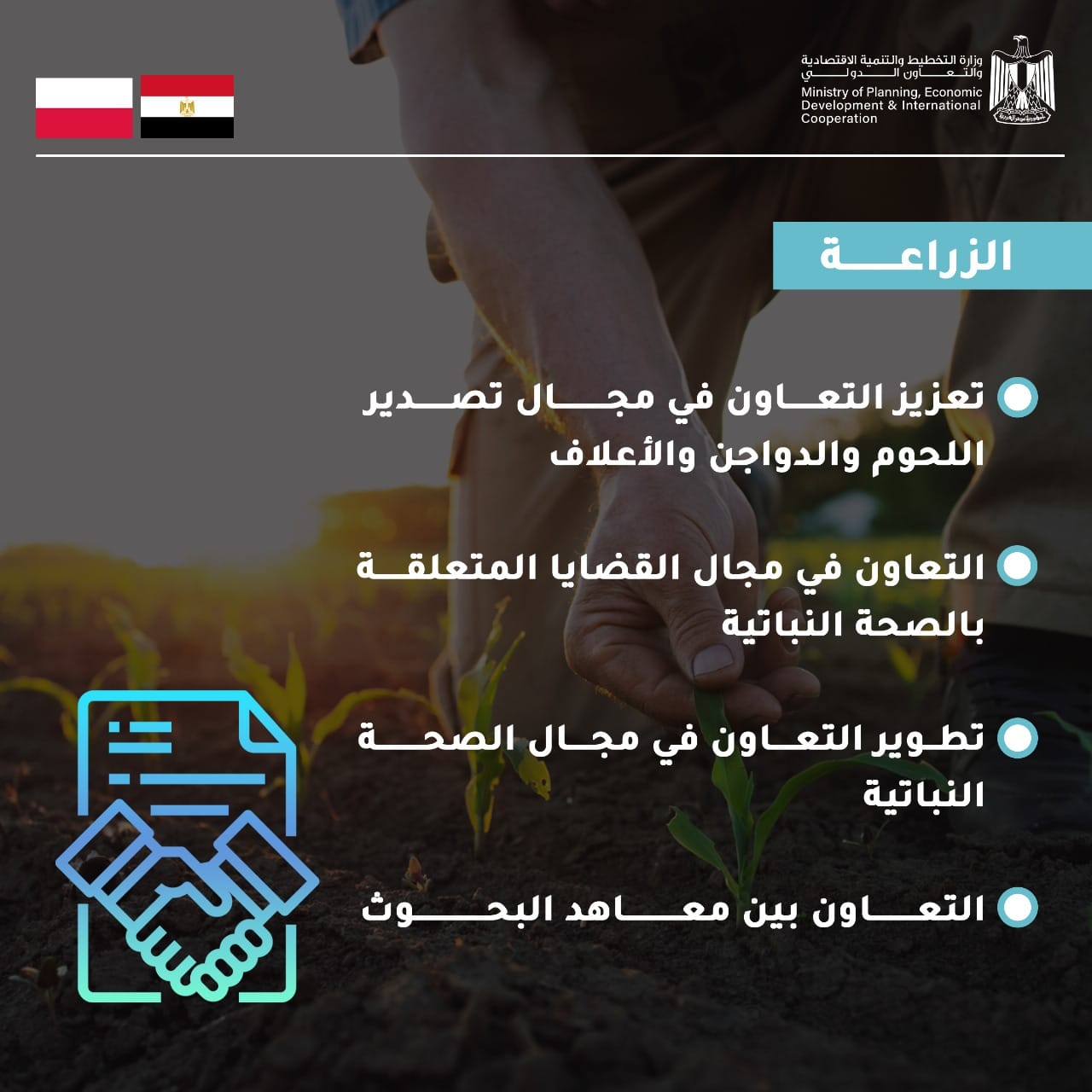 واتفق البلدان على تبادل الخبرات في مجال التحول الرقمي والاستثمار، وتبادل البعثات التجارية وتنظيم زيارات للمستثمرين المصريين والبولنديين، ودعم المبادرات التجارية وعرض الفرص الاستثمارية المتاحة في التصنيع والخدمات اللوجستية، ودفع الشراكة في قطاع البيئة والصحة والأدوية والكهرباء والطاقة المتجددة، بالإضافة إلى تعزيز التعاون لتطوير قطاع المشروعات الصغيرة والمتوسطة، ودعم الشركات الناشئة، وكذلك دعم الشراكة في مجال الأمن الغذائي والأبحاث الزراعية والثروة الحيوانية.
