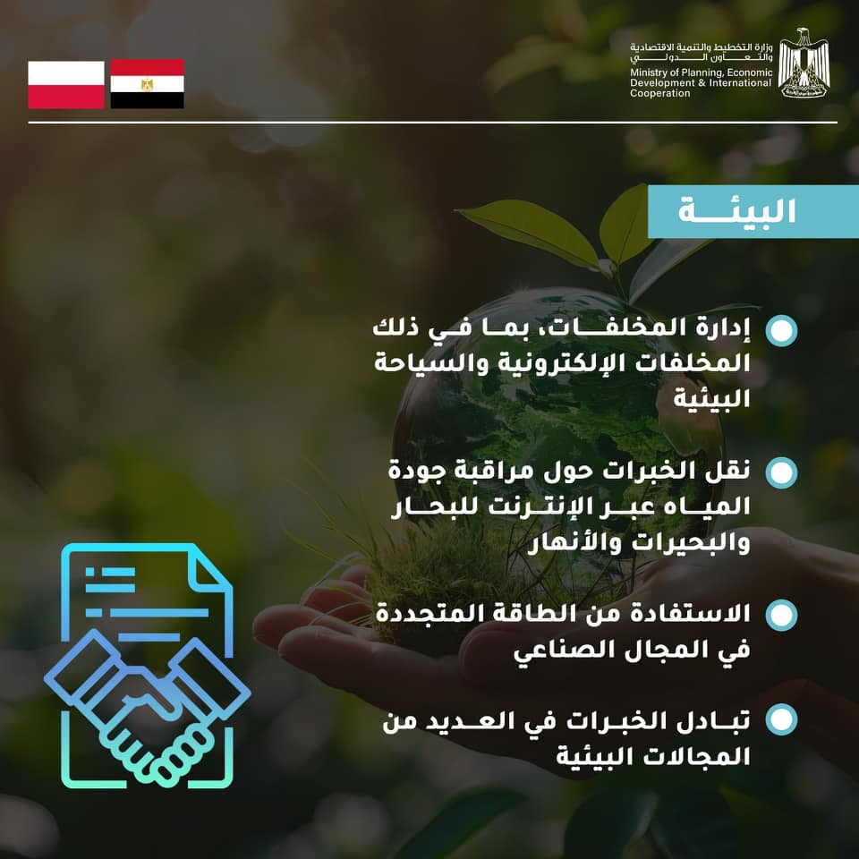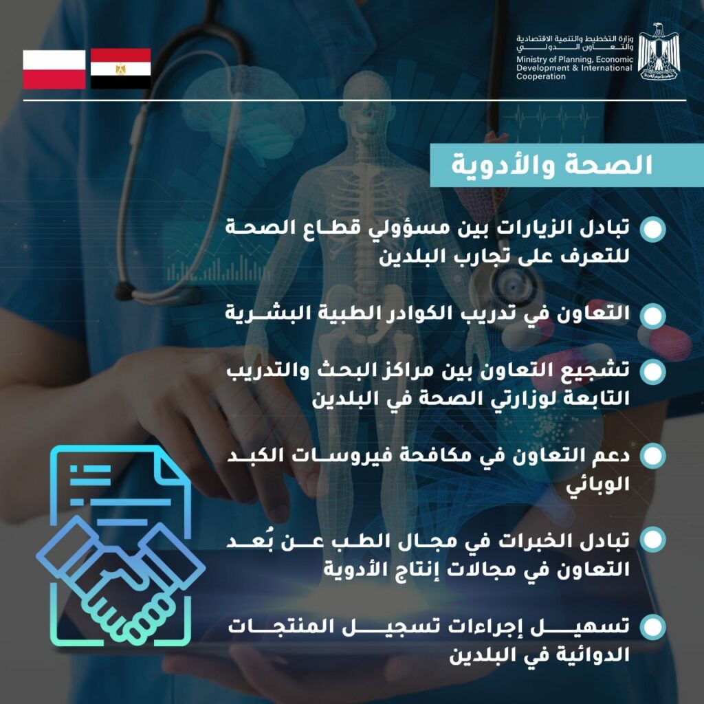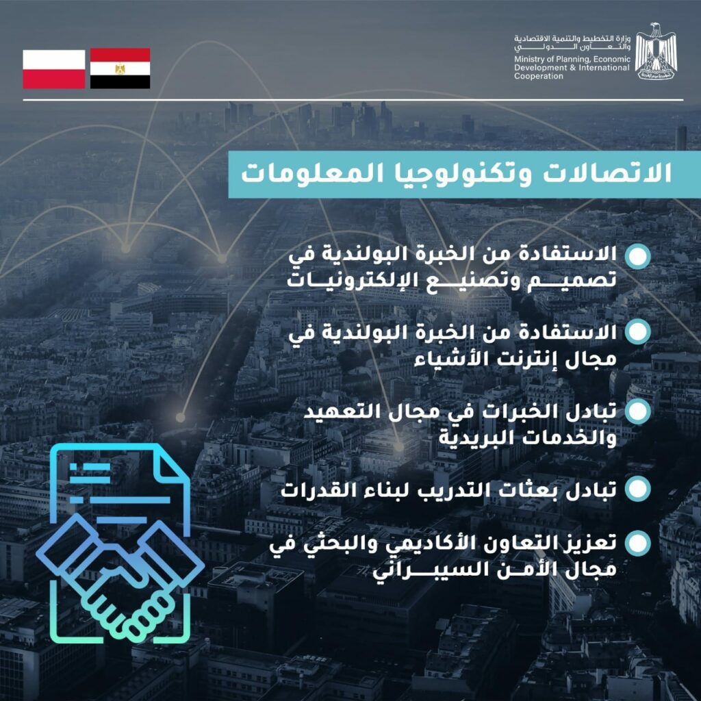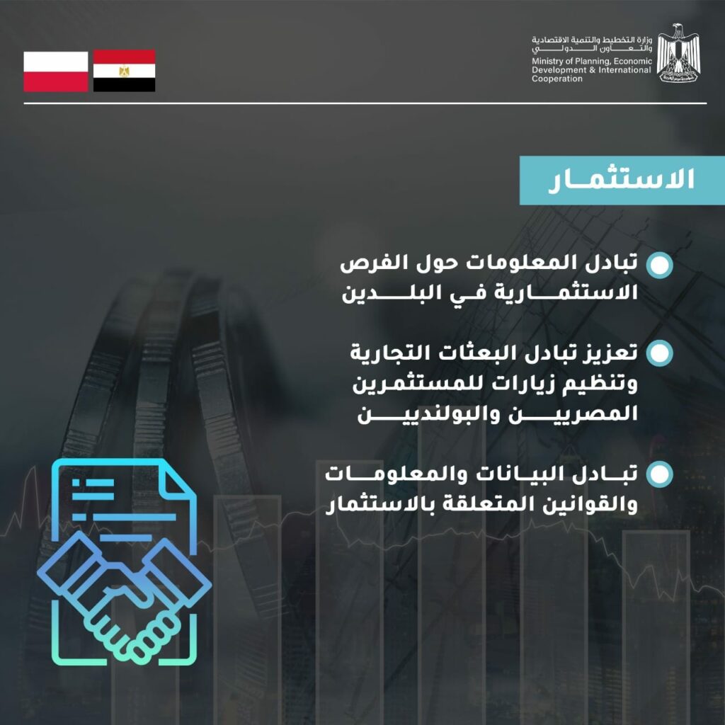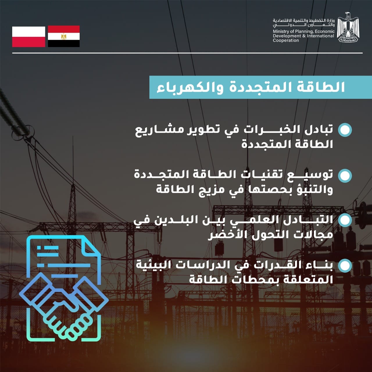 واتفق البلدان على تبادل الخبرات في مجال التحول الرقمي والاستثمار، وتبادل البعثات التجارية وتنظيم زيارات للمستثمرين المصريين والبولنديين، ودعم المبادرات التجارية وعرض الفرص الاستثمارية المتاحة في التصنيع والخدمات اللوجستية، ودفع الشراكة في قطاع البيئة والصحة والأدوية والكهرباء والطاقة المتجددة، بالإضافة إلى تعزيز التعاون لتطوير قطاع المشروعات الصغيرة والمتوسطة، ودعم الشركات الناشئة، وكذلك دعم الشراكة في مجال الأمن الغذائي والأبحاث الزراعية والثروة الحيوانية.