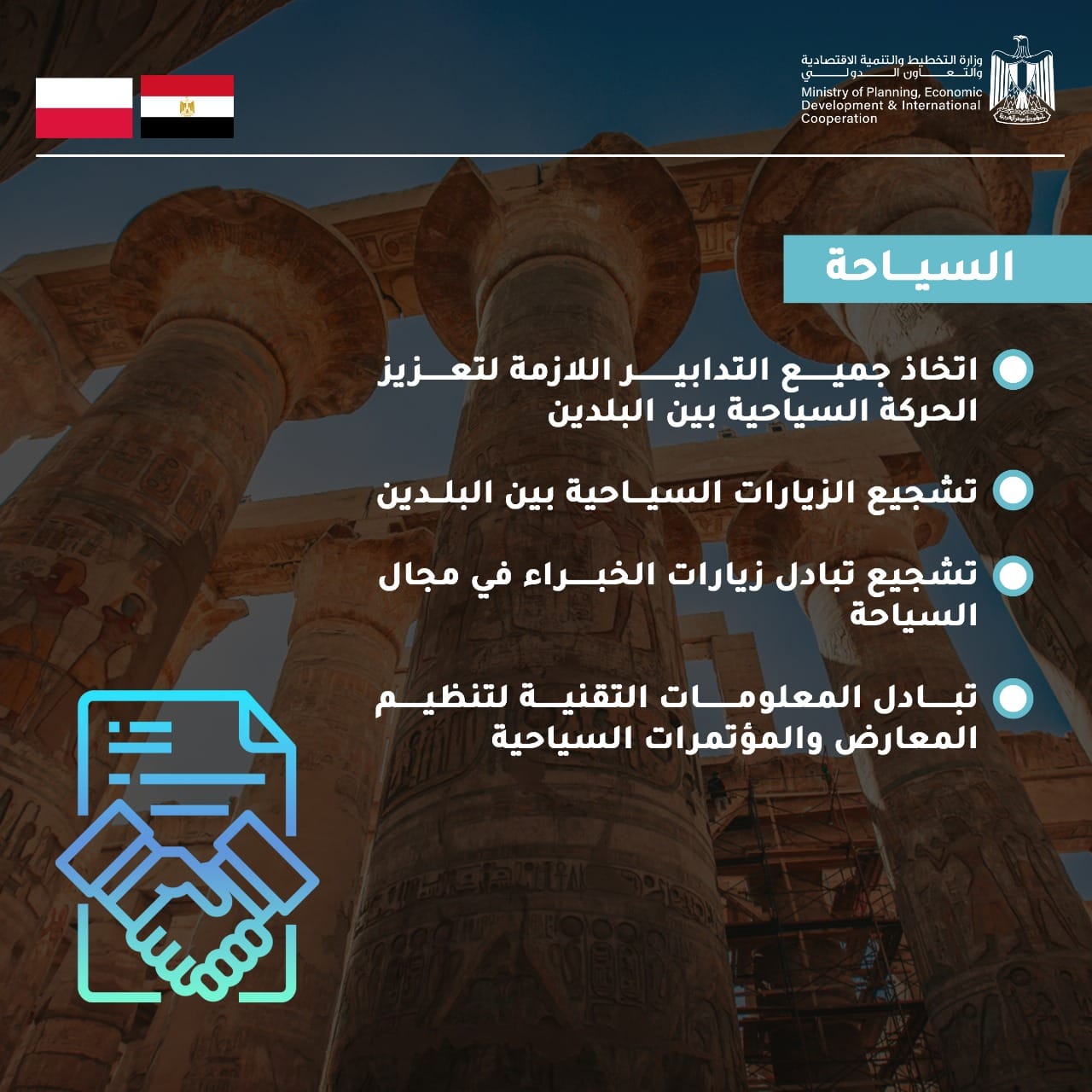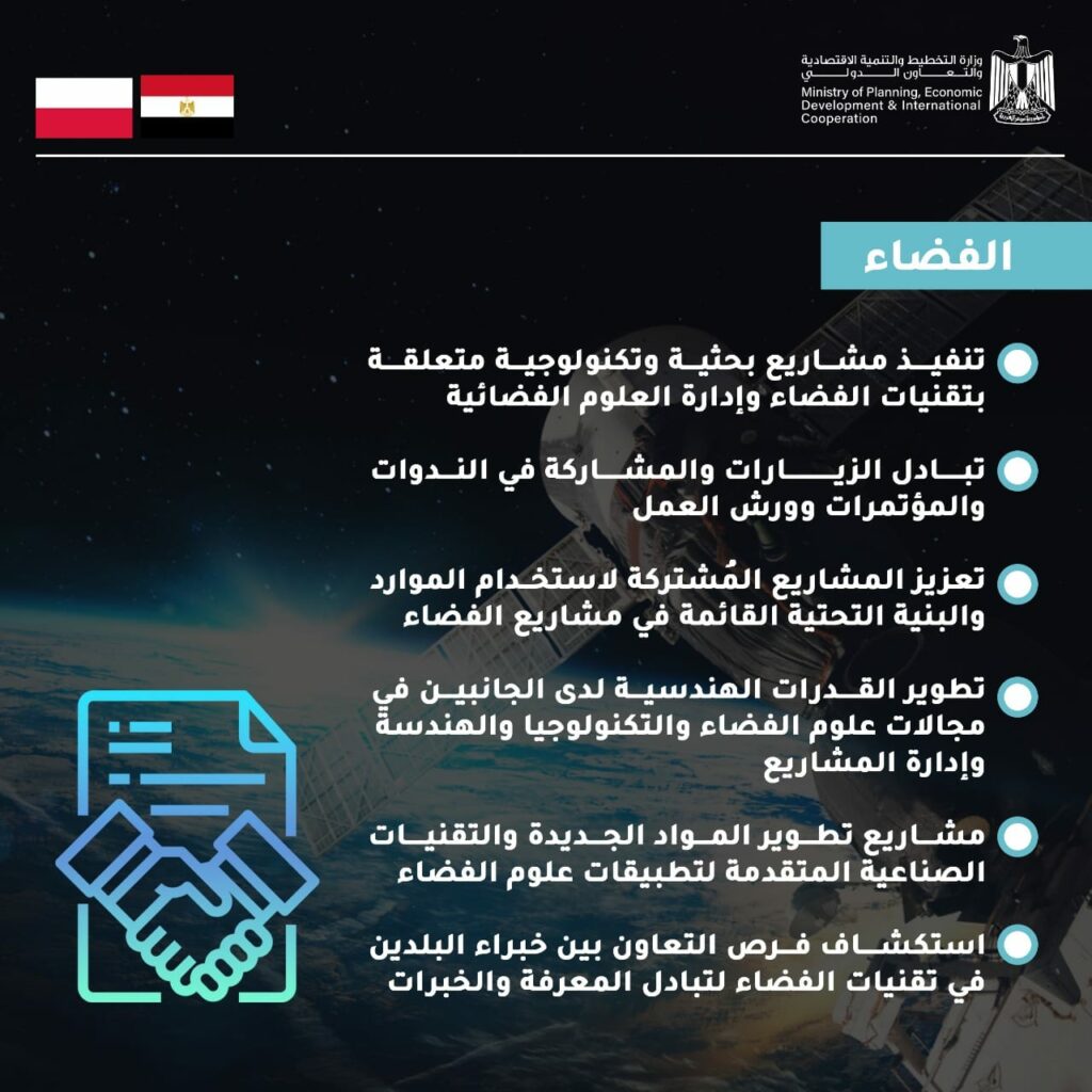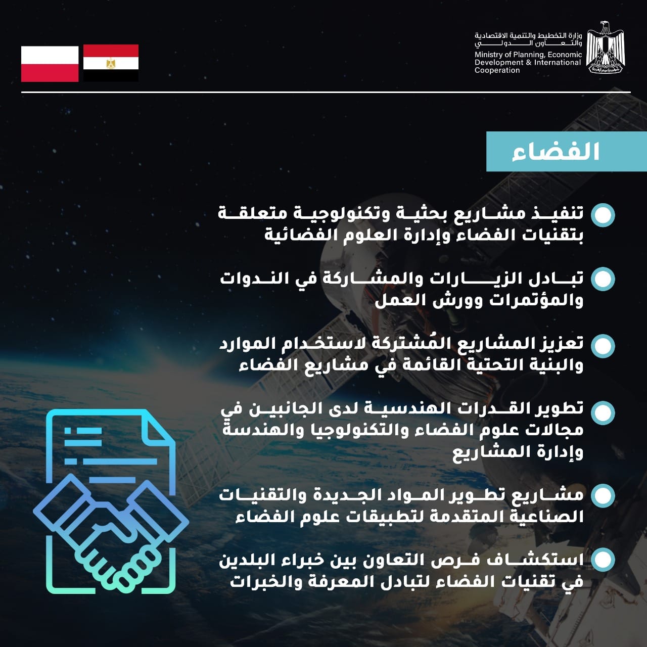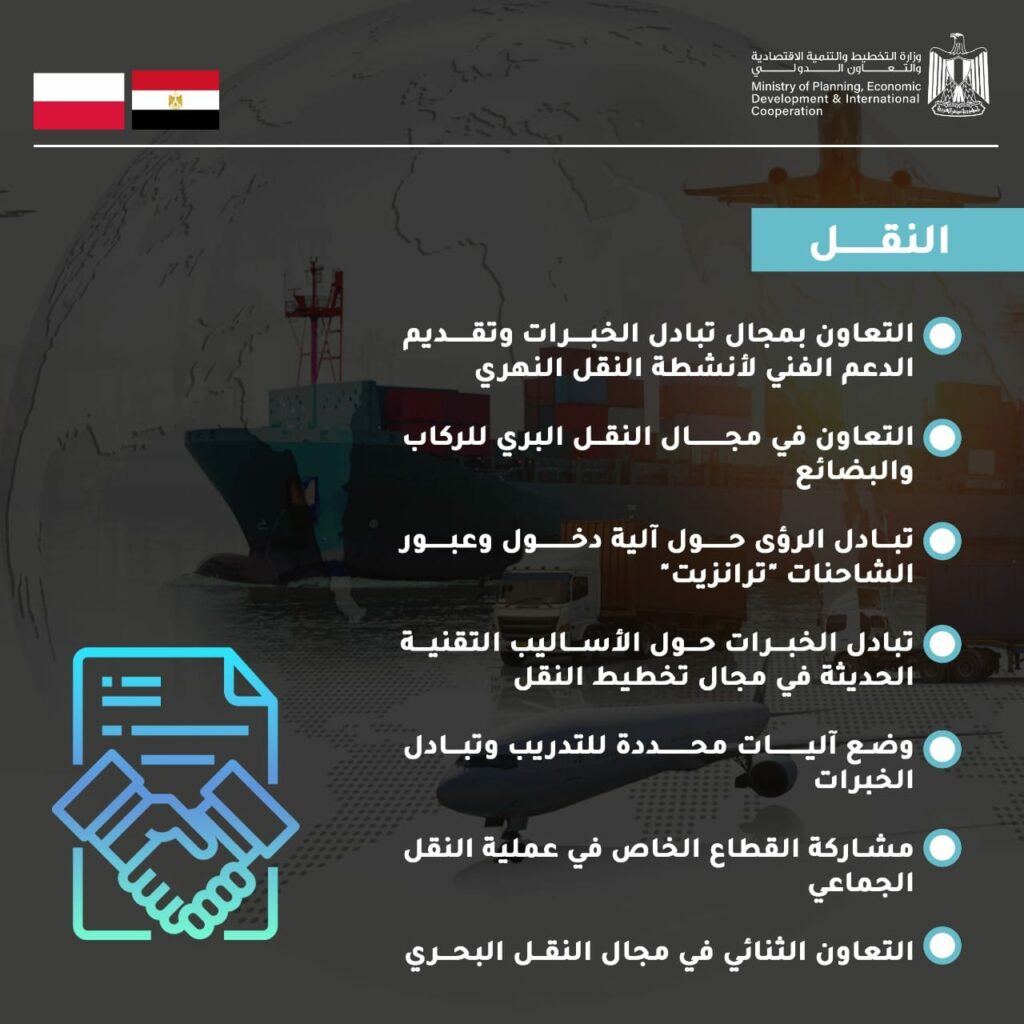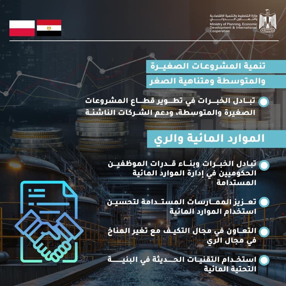 واتفق البلدان على تبادل الخبرات في مجال التحول الرقمي والاستثمار، وتبادل البعثات التجارية وتنظيم زيارات للمستثمرين المصريين والبولنديين، ودعم المبادرات التجارية وعرض الفرص الاستثمارية المتاحة في التصنيع والخدمات اللوجستية، ودفع الشراكة في قطاع البيئة والصحة والأدوية والكهرباء والطاقة المتجددة، بالإضافة إلى تعزيز التعاون لتطوير قطاع المشروعات الصغيرة والمتوسطة، ودعم الشركات الناشئة، وكذلك دعم الشراكة في مجال الأمن الغذائي والأبحاث الزراعية والثروة الحيوانية.