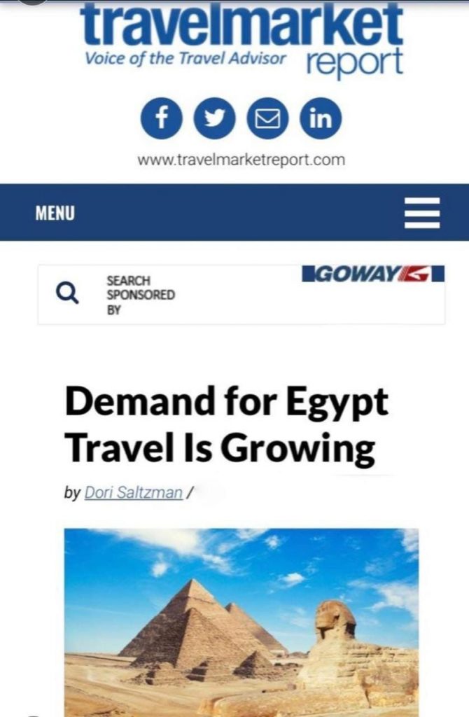 تحت عنوان “تزايد الطلب السياحى على مصر” أوضح موقع Travel Market Report الأمريكي المتخصص في السياحة أن مصر تعد من أكثر المقاصد السياحية شعبية وشهرة وتشهد إقبالاً متزايداً في الحركة السياحية، وذلك من خلال تقرير استعرض آراء عدد من أصحاب شركات السياحية والبواخر السياحية.