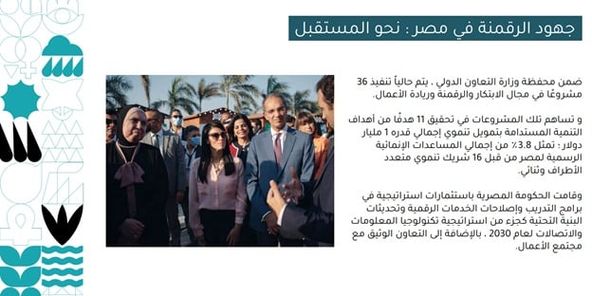وتطرقت وزيرة التعاون الدولي، إلى إطار التعاون الدولي والتمويل الإنمائي، الذي يهدف إلى تعظيم الاستفادة الاقتصادية والاجتماعية من التمويل الإنمائي، وضمان اتساق المشروعات التنموية مع الأولويات الوطنية وأهداف التنمية المستدامة، وتحسين إدارة التعاون التنموي لتنفيذ المشروعات بشكل فعال، مضيفة أنه تم عقد منصة تعاون تنسيقي مشترك بحضور الدكتور عمرو طلعت وزير الاتصالات وتكنولوجيا المعلومات، العام الماضي، حيث تم عرض استراتيجية مصر الرقمية التي تشرف عليها الوزارة وأحدث التطورات في القطاع ومساهمة التحول الرقمي في تنفيذ المبادرة الرئاسية حياة كريمة، مشيرة إلى أن محفظة التعاون الإنمائي الجارية للوزارة تضم 36 مشروعًا في مجال الابتكار والرقمنة وريادة الأعمال بقيمة مليار دولار تعزز تنفيذ 11 هدفًا من أهداف التنمية المستدامة وتم الحصول عليها من 16 شريكًا تنمويًا.