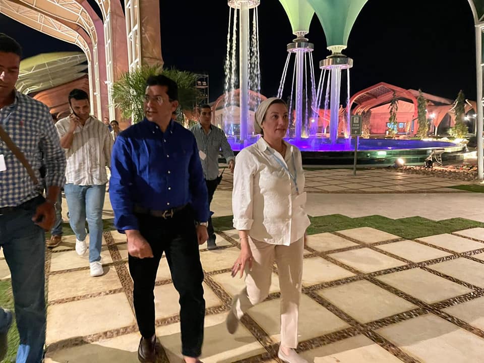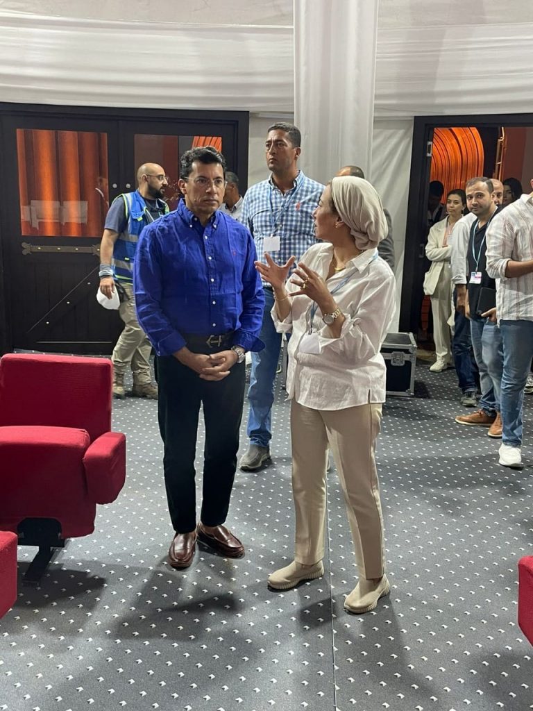 تفقد الدكتور أشرف صبحي وزير الشباب والرياضة، والدكتورة ياسمين فؤاد وزيرة البيئة المنسق الوزاري ومبعوث مؤتمر المناخ COP27، التجهيزات النهائية بالمنطقة الخضراء بمحيط المركز الدولي للمؤتمرات لاستقبال المشاركين في قمة المناخ.