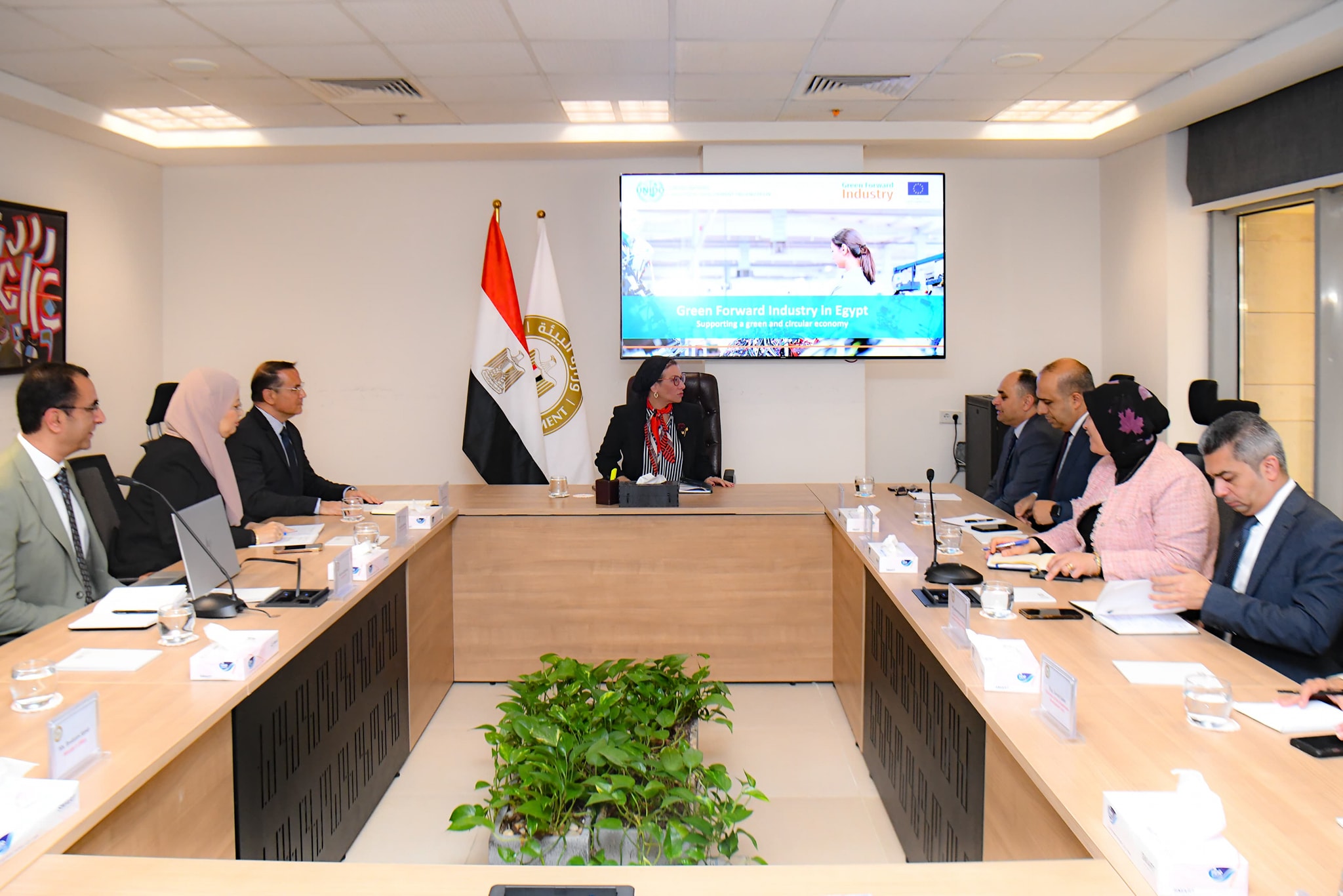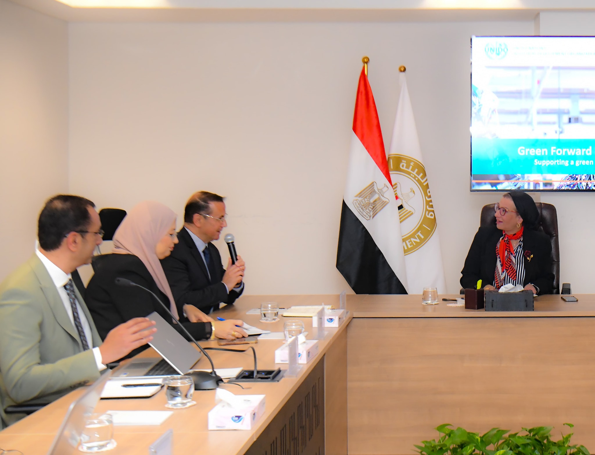 وقد تم مناقشة تنفيذ مشروع الصناعة الخضراء المتقدمة خلال الاجتماع والذي ينفذه اليونيدو بتمويل ٢٠ مليون يورو في ٨ دول كبديل لمشروع سويتش ميد المنفذ بالتعاون مع الاتحاد الأوروبي بهدف تطوير سياسات الجوار في مجال الاقتصاد الدوار والأخضر ، ويتكون المشروع من ٣ مشروعات مستقلة ومنها الخاص بالمشروعات الصغيرة والتي تعمل على تطوير السياسات لخلق بيئة مناسبة للتحول الاخضر، وذلك بتمويل ١٢ مليون يورو، ليكون نصيب مصر ١.٥ مليون يورو لمصر لمدة ٤ سنوات، من خلال مكونين رئيسيين احدهما خاص بالتنفيذ والآخر لتبادل المعلومات فيما يخص الاقتصاد الدائرى وكفاءة استخدام الموارد، وقد تم تحديد القطاعات ذات الأولوية للاقتصاد الدائري في مصر وهي السيارات الكهربائية والإلكترونيات، ودعم السياسات والاستراتيجيات الحالية والمشروعات القائمة ومنها مشروع الصناعة الخضراء GSI، ليستهدف دعم ٥٠ مشروع صغير ومتوسط في مصر باستثمارات ٤ مليون يورو ، ٢٠٪ من هذه المشروعات ستكون قادرة على الوصول للتمويل البنكي، دعم خلق نظام بيئي لصناعة التدوير في سلسلة القيمة بتعزيز سياسات توطين صناعة السيارات في مصر لتكون مركز إقليمي، والبحث عن الفرص والنماذج الدوارة التي يمكن اتباعها والشركاء المحتملين وإمكانية التكرار مع شركات أخرى.
