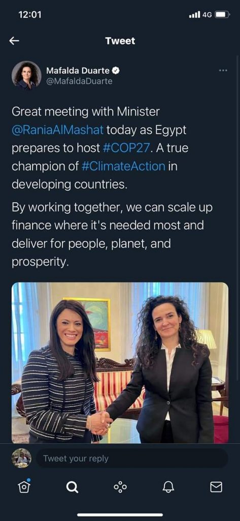 التقت الدكتورة رانيا المشاط، وزيرة التعاون الدولي، خلال زيارتها للعاصمة البريطانية لندن، السيدة مافالدا دوارتي، الرئيس التنفيذي لصناديق الاستثمار في المناخ، وهي المؤسسة التي تعمل مع بنوك التنمية متعددة الأطراف والحكومات في الدول النامية لتمويل الحلول المناخي، وذلك بحضور السيد شريف كامل، السفير المصري في المملكة المتحدة.