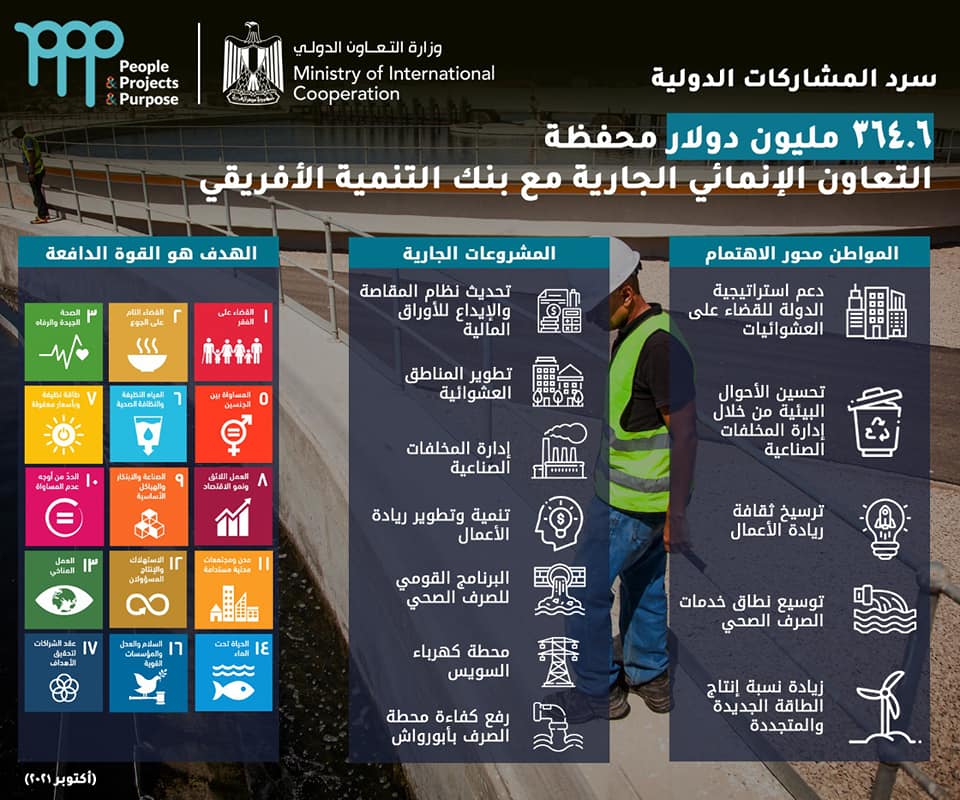 جدير بالذكر أن محفظة التعاون الجارية بين مصر والبنك الأفريقي تبلغ قيمتها 364.6 مليون دولار، لتمويل 15 مشروعًا من بينها مشروعات في قطاع المياه والصرف الصحي وريادة الأعمال والطاقة المتجددة وإدارة المخلفات الصناعية، ودعم قدرات العاملين بالبرلمان وتطوير المناطق العشوائية وخلال العام الجاري تم التوقيع مع البنك على اتفاقيات تمويل تنموي للمساهمة في تمويل عدد من المشروعات من بينها اتفاقية بقيمة 109 مليون يورو لتمويل برنامج الصرف الصحي المتكامل بالمناطق الريفية بصعيد مصر- الأقصرتستفيد منها وزارة الإسكان، واتفاقية أخرى بقيمة 145 مليون يورو لتحسين عوامل الكفاءة والأمان بالسكك الحديدية تستفيد منها وزارة النقل.