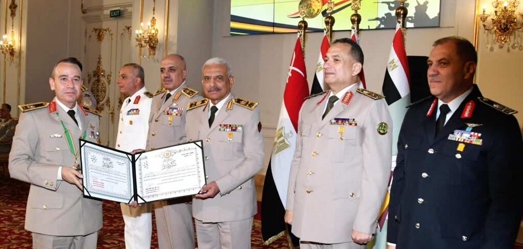 وقام الفريق أول / عبدالمجيد صقر بتقليد القادة المكرمين وسام الجمهورية الذى صدق على منحه لهم السيد الرئيس / عبدالفتاح السيسى رئيس الجمهورية القائد الأعلى للقوات المسلحة تقديراً لجهودهم وتفانيهم فى أداء مهامهم الوطنية طوال مدة خدمتهم بالقوات المسلحة .