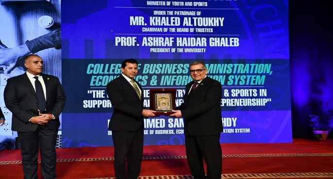 جاء ذلك خلال مشاركة الوزير اليوم /الاثنين/ في اللقاء الحواري الذي أقامته جامعة مصر للعلوم والتكنولوجيا تحت عنوان (دور وزارة الشباب والرياضة في دعم المشروعات الصغيرة وريادة الأعمال)، بتنظيم كلية الإدارة والاقتصاد ونظم المعلومات، وبمشاركة مجموعة كبيرة من طلاب كليات الجامعة.