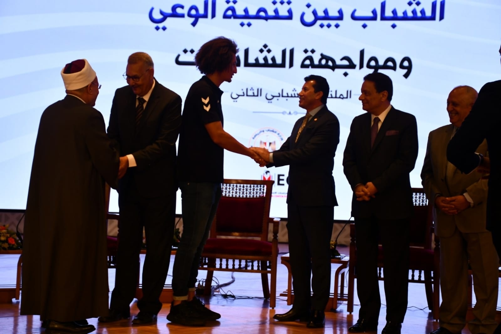 قام أشرف صبحي وزير الشباب والرياضة، اليوم الثلاثاء، بتكريم اللاعب علي زين لاعب المنتخب المصري لكرة اليد، والحائز علي دوري أبطال أوروبا مع فريق برشلونة الإسباني، والمتنقل حديثًا إلي نادي دينامو بوخارست الروماني، وسط ألف شاب وفتاة، بفعاليات الملتقي الثاني لمواجهة الشائعات وتأثيرها على الأمن القومى “تصدوا معنا” تحت شعار الشباب بين تنمية الوعي ومواجهة الشائعات.