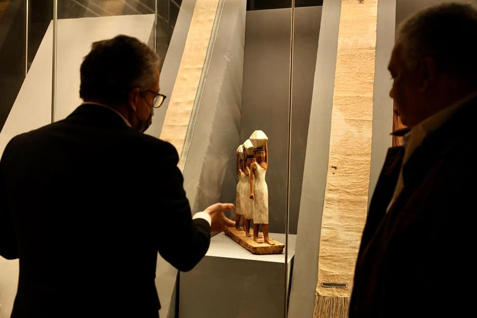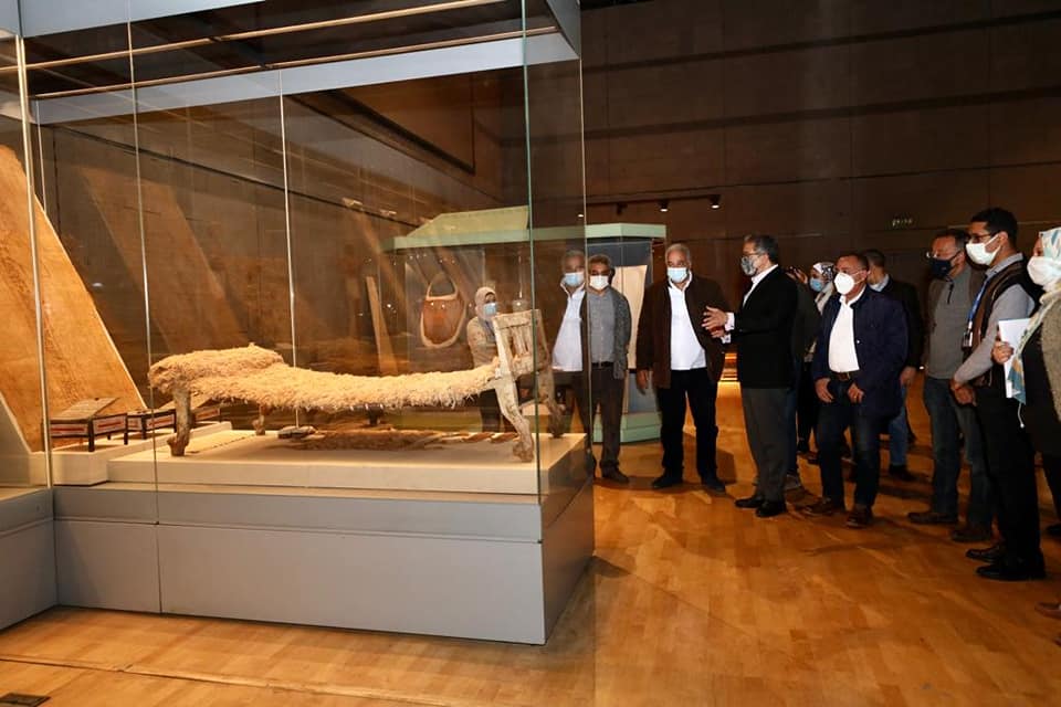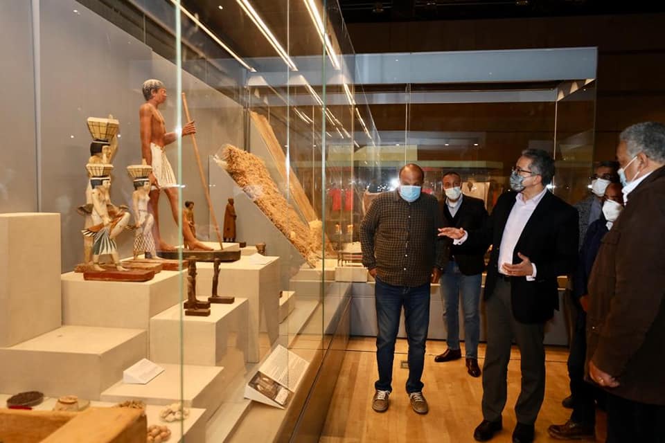 ورافق الوزير خلال الجولة: الدكتور أحمد غنيم الرئيس التنفيذي لهيئة المتحف، والدكتور مصطفى وزيري الأمين العام للمجلس الأعلى للآثار، والدكتور محمود مبروك مستشار وزير السياحة والآثار للعرض المتحفي، ومؤمن عثمان رئيس قطاع المتاحف وعضو لجنة سيناريو العرض، والدكتور أسامة عبدالوارث عضو لجنة سيناريو العرض.