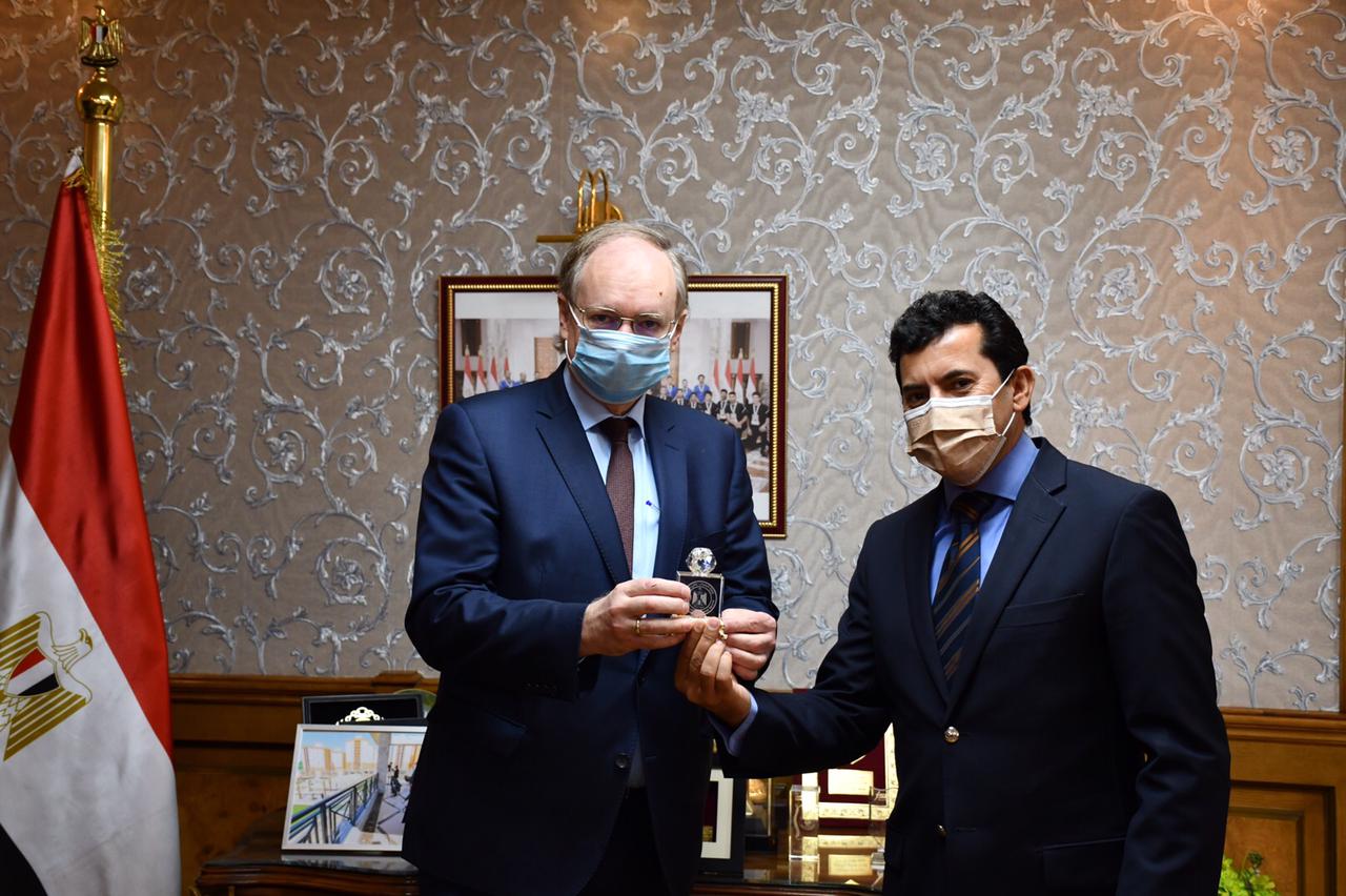 إستقبل الأستاذ الدكتور أشرف صبحي وزير الشباب والرياضة صباح اليوم الخميس بمقر مكتبه بديوان عام الوزارة كرستيان برجر سفير الاتحاد الأوروبي بالقاهرة ، يرافقه السفير بدر عبالعاطي مساعد وزير الخارجية للشئون الأوروبية .