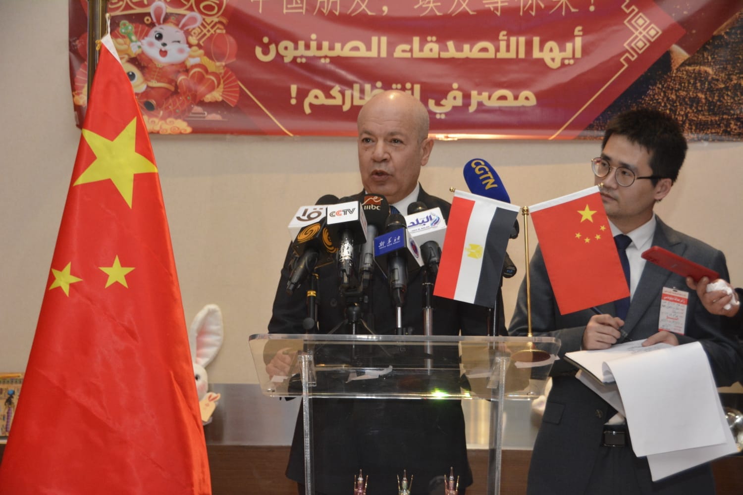 وفي هذا السياق وفى كلمة الفريق محمد عباس وزير الطيران المدني التى ألقاها بالإنابة عنه المهندس يحيى زكريا رئيس الشركة القابضة مصر للطيران خلال المؤتمر الصحفى الذى انعقد على هامش الاحتفال رحب بالفوج السياحي الصيني فى بلده الثانى مصر مؤكداً على عمق العلاقات المصرية الصينية في مختلف المجالات وبخاصة مجال النقل الجوي لما تمتلكه مصر والصين من حضارتين عريقتين مليئة بالإنجازات وأشار الى تطوير منظومة المطارات والارتقاء بجودة الخدمات لجذب مزيد من الحركة السياحية لمصر.