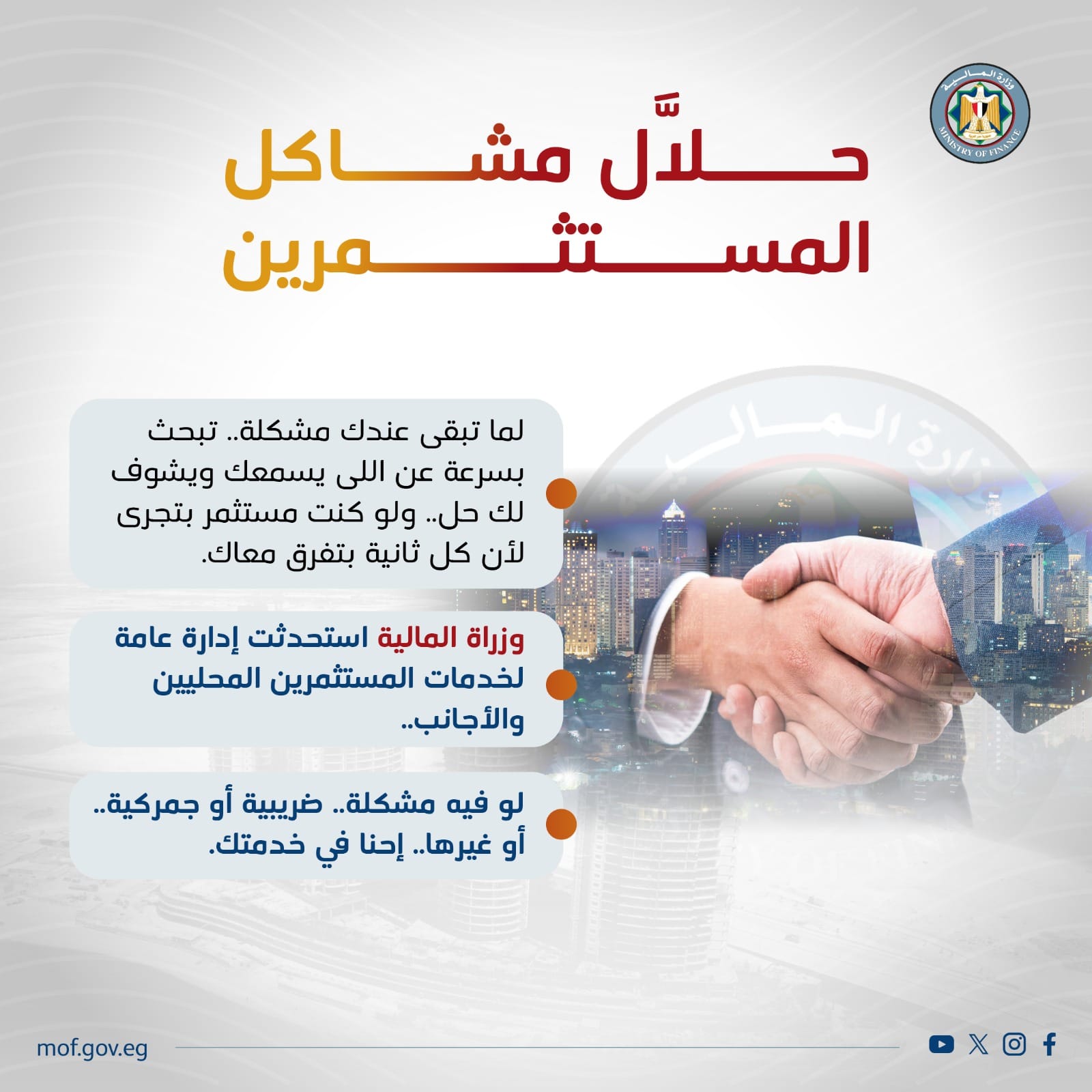 قالت نسرين لاشين مدير عام الإدارة العامة لخدمات المستثمرين، إن هناك آليات متعددة لتلقي طلبات المستثمرين المحليين والأجانب ميدانيًا من خلال حضور اللقاءات الحوارية التي تعقدها الغرف التجارية ومنظمات الأعمال والسفارات الأجنبية، وإلكترونيًا عبر الإيميل المتاح على الموقع الرسمي لوزارة المالية investorscareunit@mof.gov.eg وهاتفيًا علي أرقام 0226851261 – 0226851655 – 01018333396، إضافة إلى التعامل الفوري مع المشاكل التي يتقدم بها المستثمرون إلى الإدارة حتي تلك التي تخرج عن نطاق اختصاص وزارة المالية، حيث يتم التعاون مع الوزارات والجهات الأخرى لسرعة إنجاز هذه الطلبات ، موضحة أننا نتحرك على الفور بالتنسيق مع الجهات المختصة سواءً الضرائب أو الجمارك أو غيرها لتلبية طلبات المستثمرين وحل مشاكلهم حيث تقوم الإدارة العامة لخدمات المستثمرين بالتواصل المباشر مع المأموريات المختصة فيما يتعلق بحالات رد الضريبة بما يضمن تسريع وتيرة الإجراءات والتواصل المباشر أيضًا مع المنافذ الجمركية لمساعدة المستثمرين في سرعة إنهاء إجراءات الإفراج الجمركي بما يسُهم في تشجيعهم علي التوسع في أنشطتهم الاستثمارية.