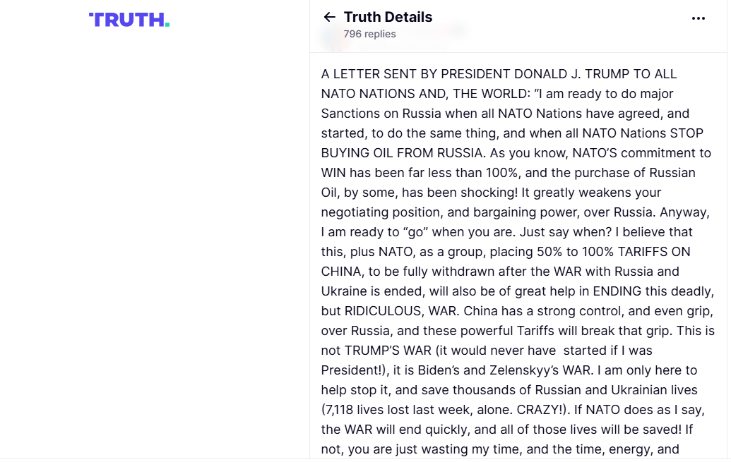 إلى ذلك، اعتبر أن فرض رسوم جمركية بنسبة 50٪ إلى 100٪ على الصين، والتي يمكن أن ترفع لاحقا بعد انتهاء الحرب الروسية الأوكرانية، سيكون أيضًا مفيدًا للغاية في إنهاء “هذه الحرب المميتة”. ورأى أن بكين “تتمتع بسيطرة قوية، بل وحتى قبضة، على موسكو، إلا أن هذه التعريفات القوية ستضعف تلك القبضة.