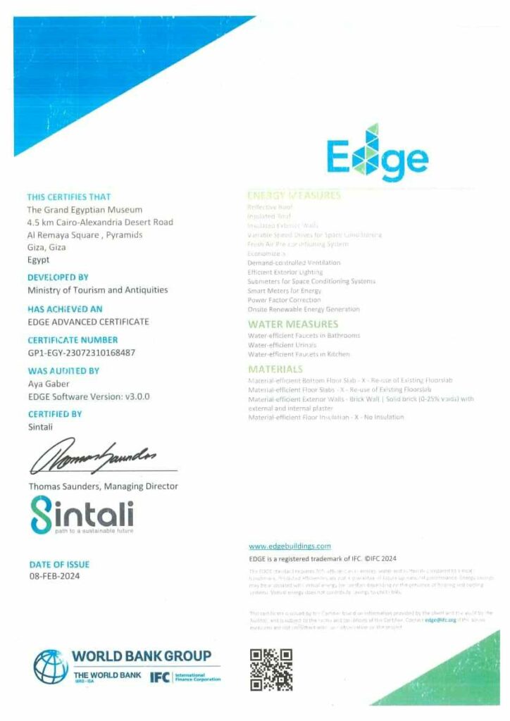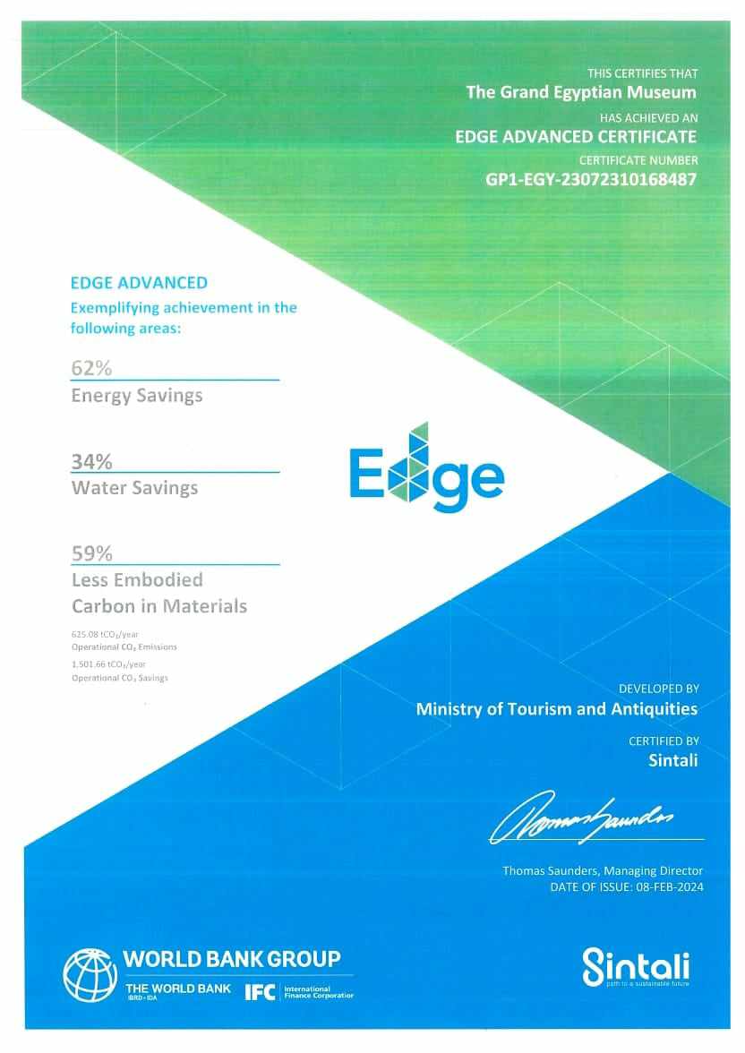 مُنح مشروع المتحف المصري الكبير على الشهادة الدولية EDGE Advance إيدچ المتطورة للمباني الخضراء والمعتمدة من مؤسسة التمويل الدولية أحد مؤسسات مجموعة البنك الدولي، كأول متحف أخضر في أفريقيا والشرق الأوسط.