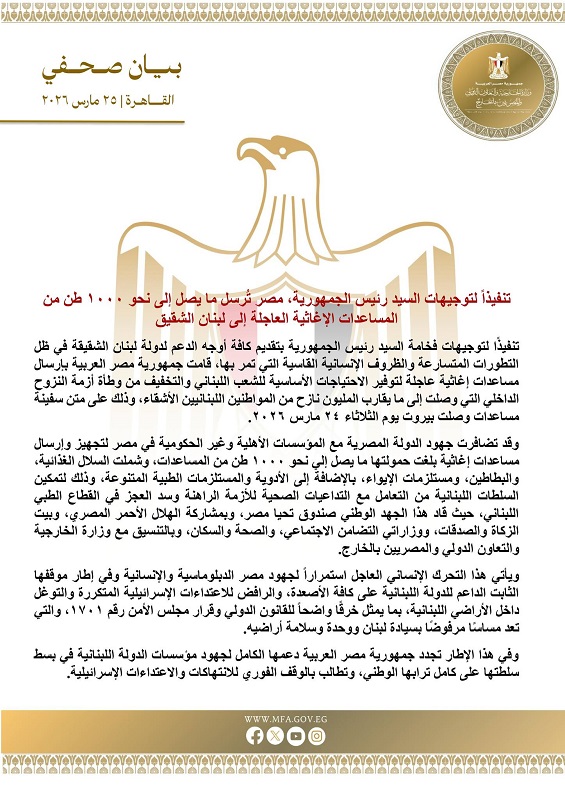 تنفيذًا لتوجيهات الرئيس السيسى .. مصر تُرسل ما يصل لنحو ألف طن من المساعدات الإغاثية العاجلة للبنان