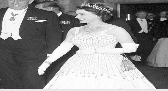 ارتدت الملكة إليزابيت هذا الثوب لأول مرة في العام 1962 لدى حضورها العرض الأول لفيلم “لورانس العرب” في مسرح الأوديون اللندني الشهير، ومرة أخرى في العام 1967 خلال افتتاح دورة البرلمان البريطاني.
