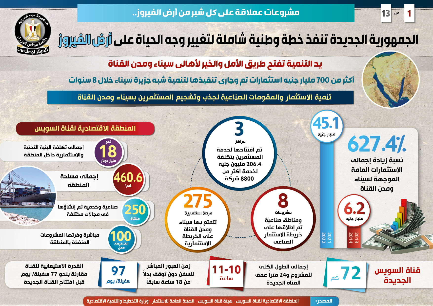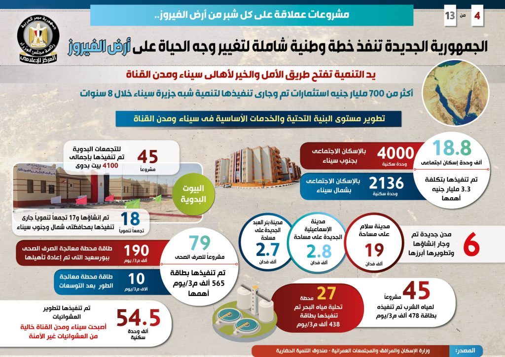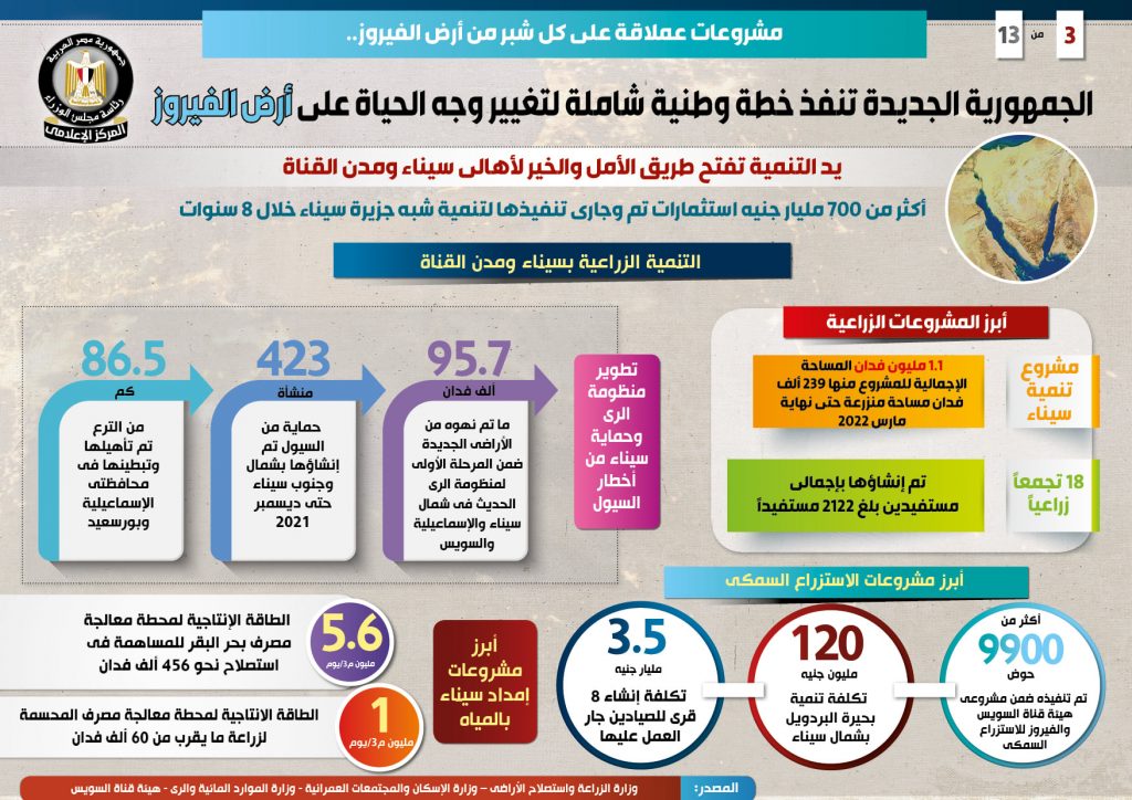 جاء ذلك في التقرير الذي نشره المركز الإعلامي وتضمن إنفوجرافات تسلط الضوء على الخطة الوطنية والشاملة للجمهورية الجديدة من أجل تغيير وجه الحياة على أرض الفيروز من خلال إطلاق مشروعات عملاقة على كل شبر منها، باستثمارات تبلغ أكثر من 700 مليار جنيه تم وجار تنفيذها لتنمية سيناء ومدن القناة خلال 8 سنوات .