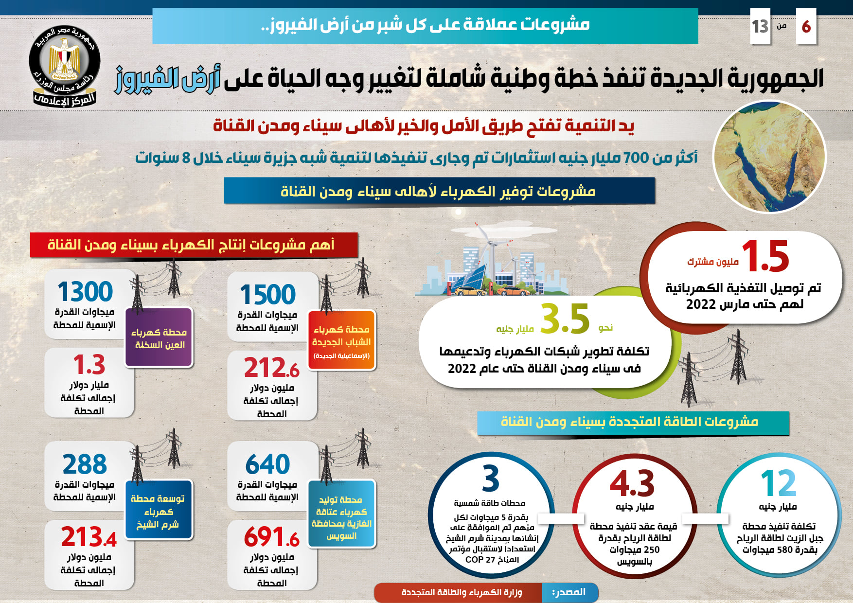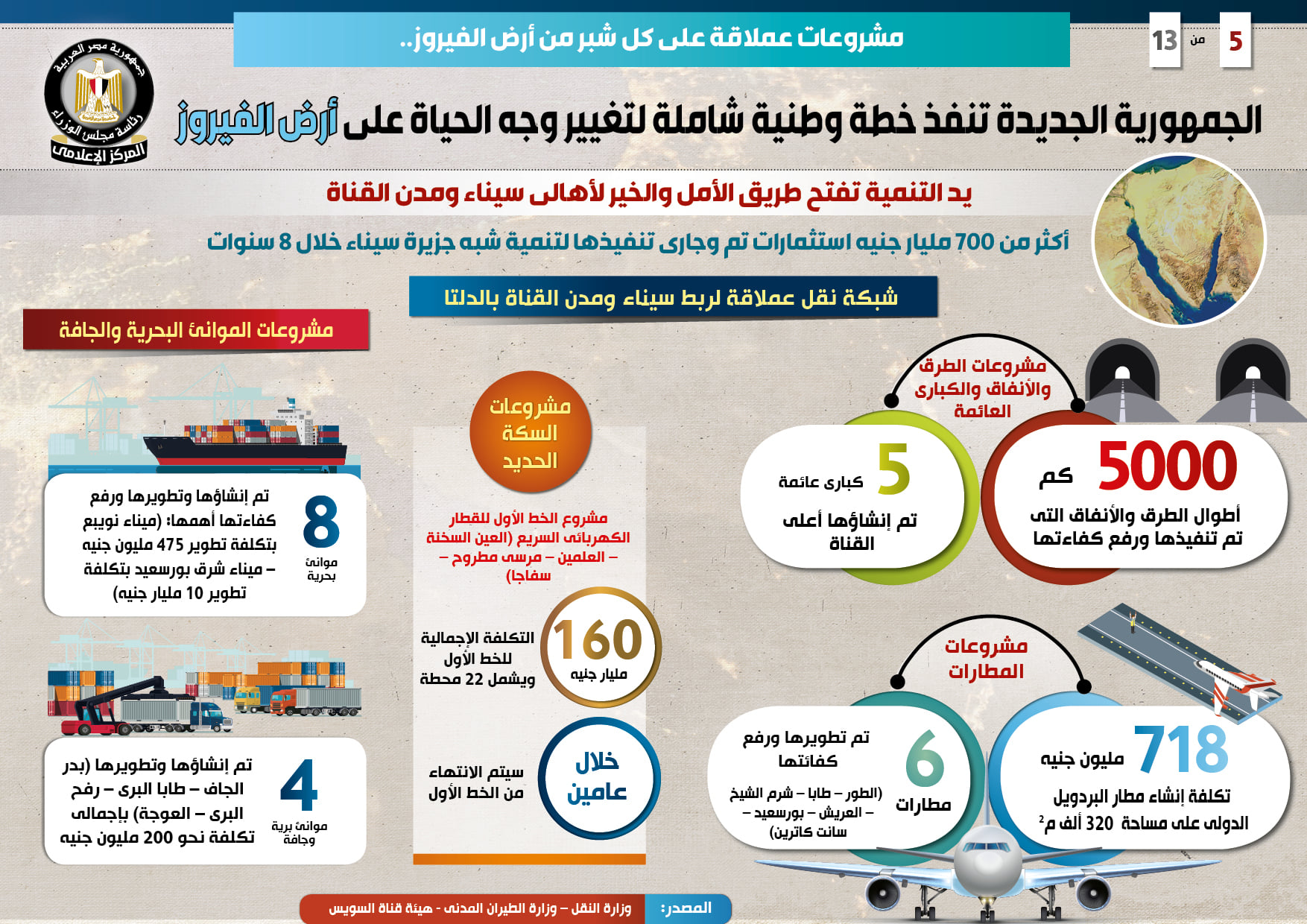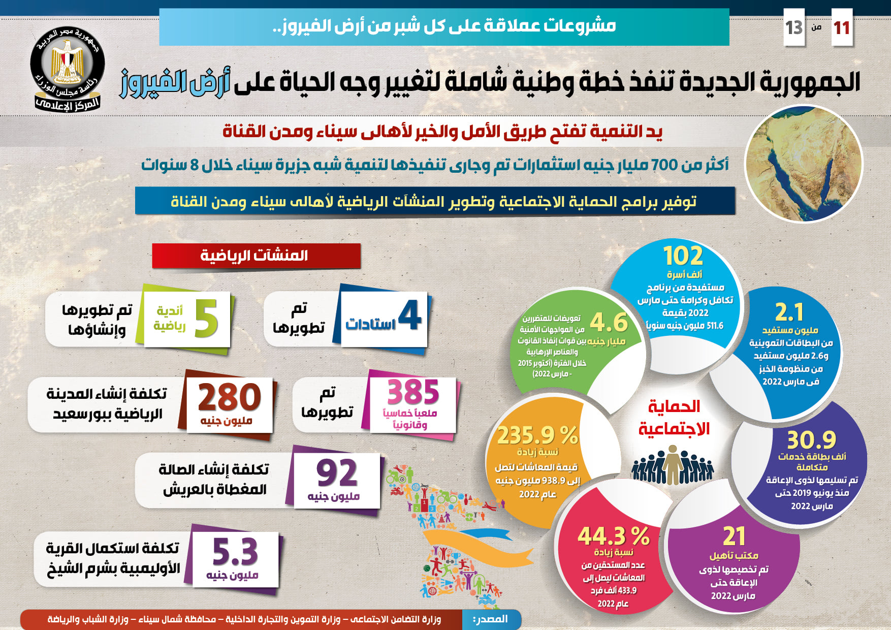 جاء ذلك في التقرير الذي نشره المركز الإعلامي وتضمن إنفوجرافات تسلط الضوء على الخطة الوطنية والشاملة للجمهورية الجديدة من أجل تغيير وجه الحياة على أرض الفيروز من خلال إطلاق مشروعات عملاقة على كل شبر منها، باستثمارات تبلغ أكثر من 700 مليار جنيه تم وجار تنفيذها لتنمية سيناء ومدن القناة خلال 8 سنوات .