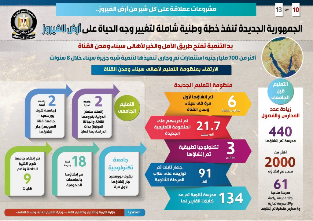 وأبرز التقرير جهود الارتقاء بمنظومة التعليم لأهالي سيناء ومدن القناة، ففيما يتعلق بالتعليم قبل الجامعي، فقد زاد عدد المدارس والفصول حيث تم إنشاء 440 مدرسة وأكثر من 2000 فصل، فضلاً عن إنشاء 61 مدرسة صناعية و19 مدرسة زراعية و39 مدرسة تجارية و6 مدرارس فندقية.