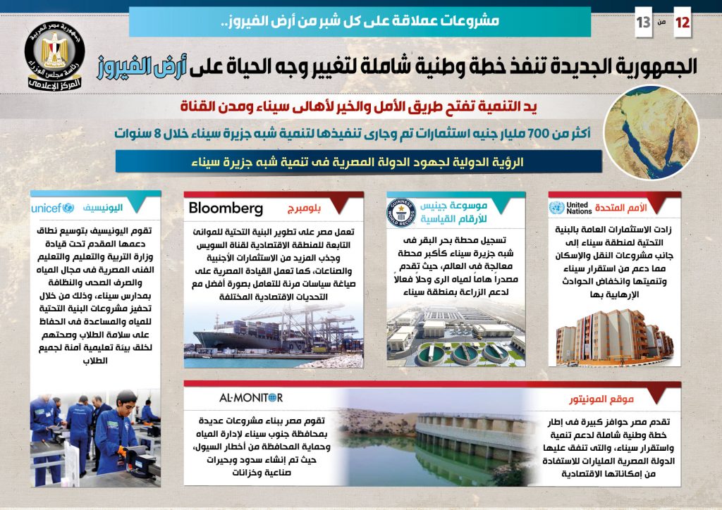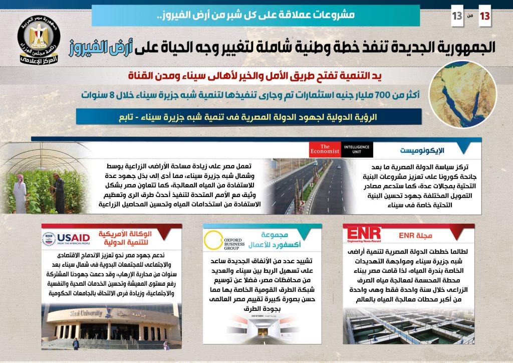 وأوضح أن ذلك بجانب الاهتمام بالقطاعات الخدمية كالتعليم والصحة والزراعة، وكذلك التركيز على توفير كافة أشكال الدعم والحماية الاجتماعية لأهالي سيناء، وهو ما أسهم في إحداث نقلة نوعية غيرت وجه الحياة في شبه جزيرة سيناء، وتحويلها إلى منطقة جذب واعدة وبيئة مواتية للاستثمار والتعمير في ظل ما تشهده من حالة استقرار أمني، الأمر الذي دفع أيضاً المؤسسات الدولية إلى الإشادة بالجهود المتواصلة لتنمية سيناء على مختلف الأصعدة.