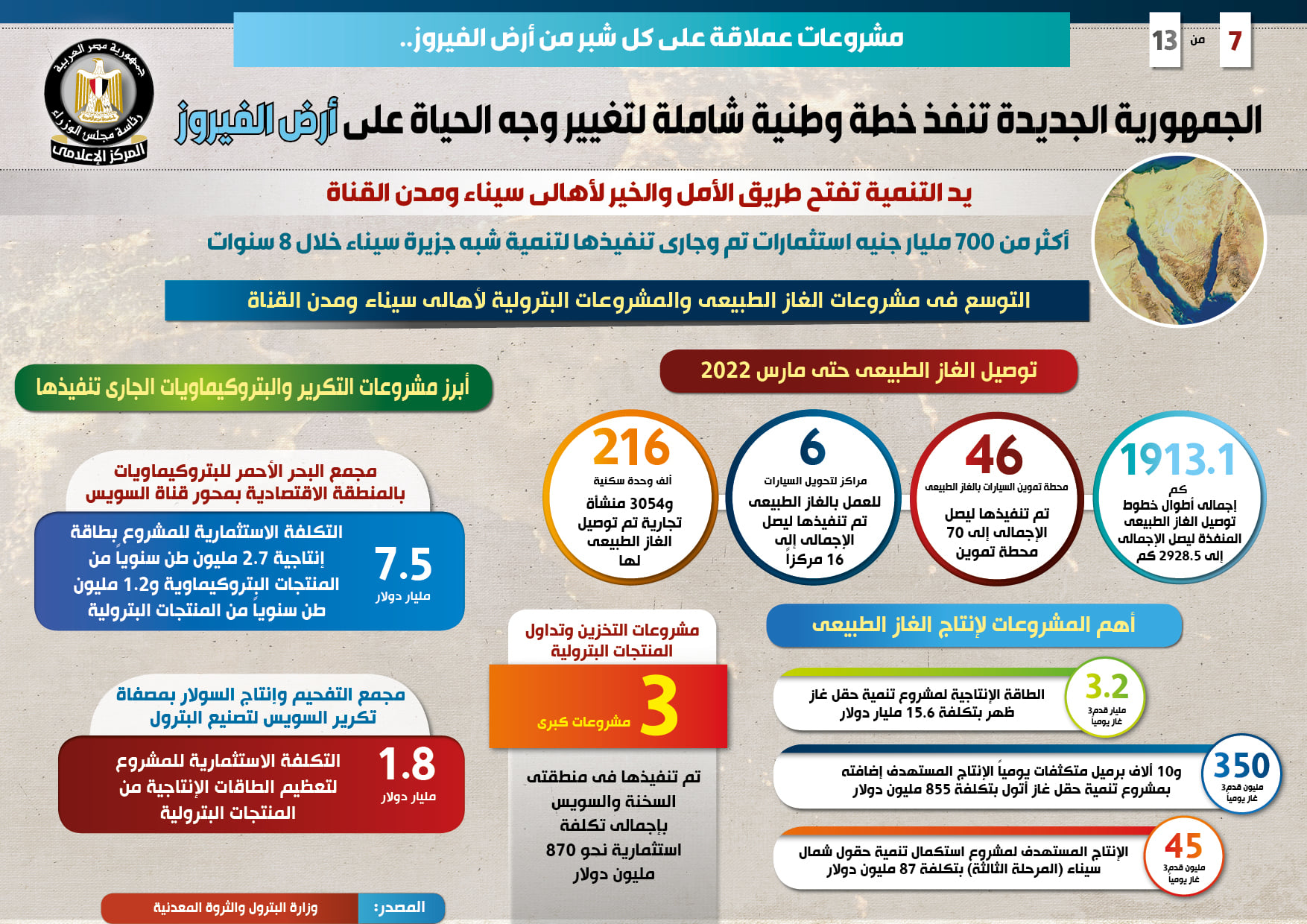 وعلى صعيد التوسع في مشروعات الغاز الطبيعي والمشروعات البترولية لأهالي سيناء ومدن القناة، فقد بلغ إجمالي أطوال خطوط توصيل الغاز الطبيعي المنفذة 1913.1 كم ليصل الإجمالي إلى 2928.5 كم، كما تم تنفيذ 46 محطة تموين السيارات بالغاز الطبيعي ليصل الإجمالي إلى 70 محطة تموين، فضلاً عن تنفيذ 6 مراكز لتحويل السيارات للعمل بالغاز الطبيعي ليصل الإجمالي إلى 16 مركزاً، إلى جانب توصيل الغاز الطبيعي لـ 216 ألف وحدة سكنية و3054 منشأة تجارية، وذلك حتى مارس 2022.