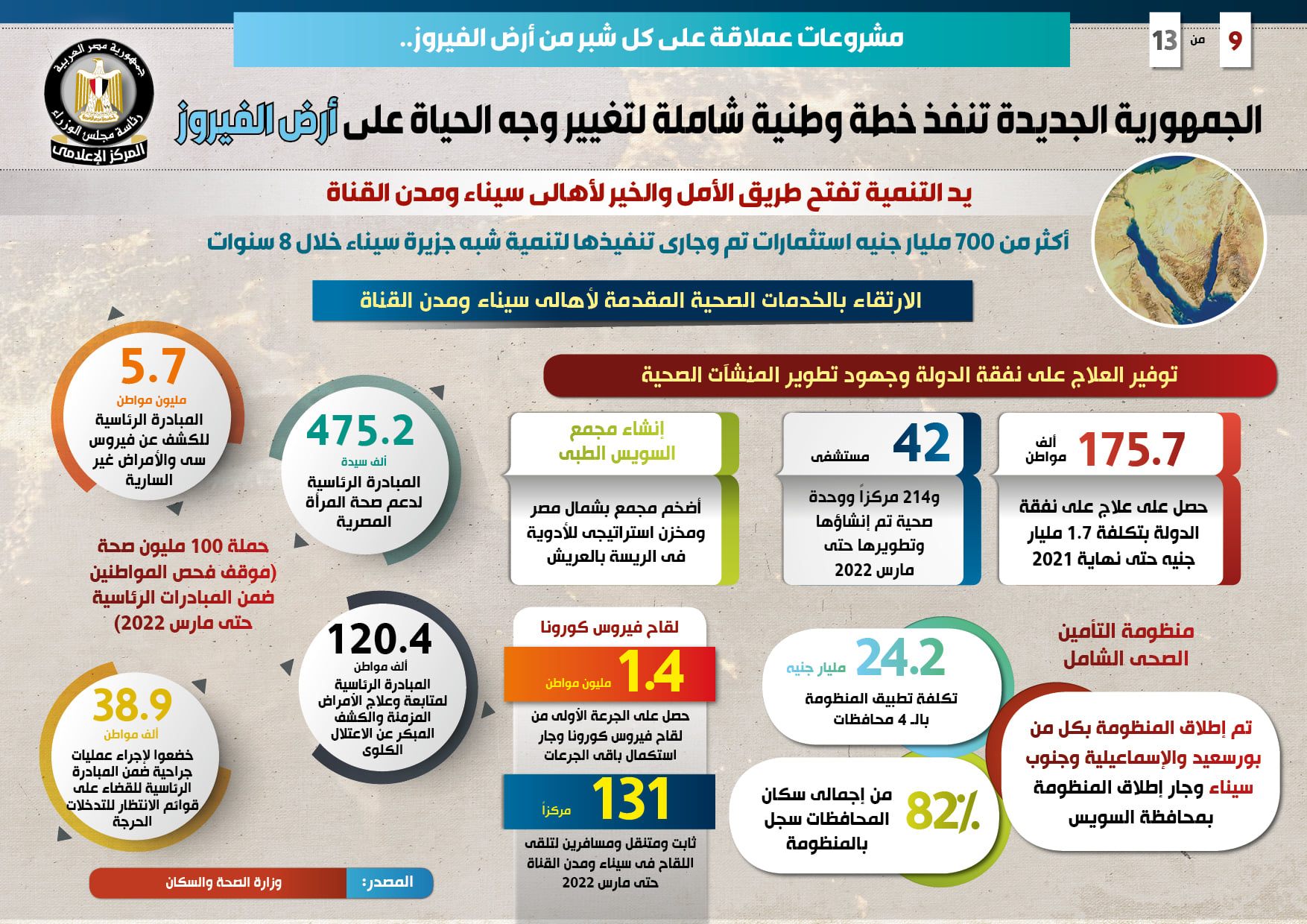 وورد في التقرير جهود الدولة من أجل الارتقاء بالخدمات الصحية المقدمة لأهالي سيناء ومدن القناة، وفيما يتعلق بتوفير العلاج على نفقة الدولة وجهود تطوير المنشآت الصحية، فقد استفاد 175.7 ألف مواطن من العلاج على نفقة الدولة بتكلفة 1.7 مليار جنيه حتى نهاية عام 2021، فضلاً عن إنشاء42 مستشفى و214 مركزاً ووحدة صحية وتطويرها حتى مارس 2022، إلى جانب إنشاء مجمع السويس الطبي والذي يعد أضخم مجمع بشمال مصر، ومخزن استراتيجي للأدوية في الريسة بالعريش.
