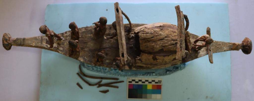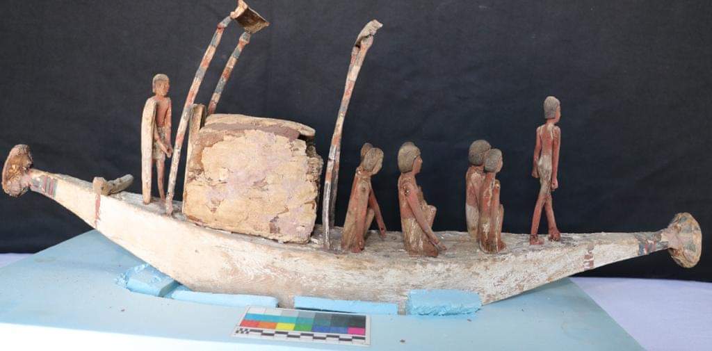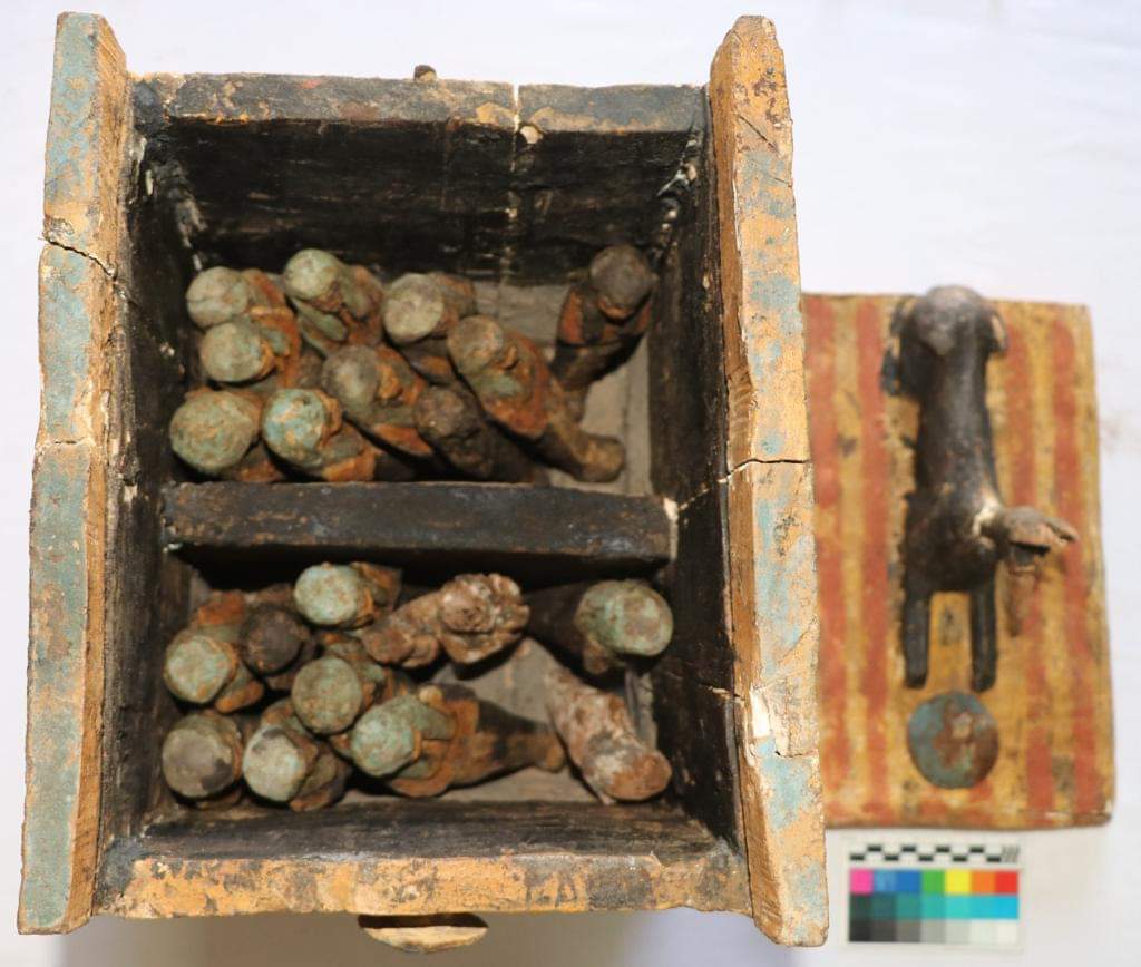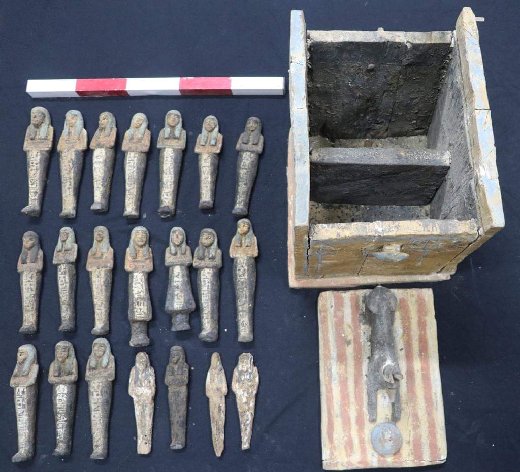 وأوضح أنه تم كذلك العثور على تابوت خشبي على الهيئة الآدمية لنفس الشخص، بالإضافة إلى العديد من تماثيل الأوشابتي من الخشب والحجر الفيانس من عصر الدولة الحديثة بالإضافة إلى مجموعة من الأقنعة الخشبية وكذلك مقصورة الإله انوبيس إله الجبانة، وعثر له على تماثيل بحاله جيدة وكذلك العديد من الألعاب التي كان يلعب بها المتوفى في العالم الآخر مثل لعبة (السنت) التي تشبه الشطرنج حاليا، وكذلك لعبة العشرين مسجل عليها اسم الشخص الذي كان يلعب بها.