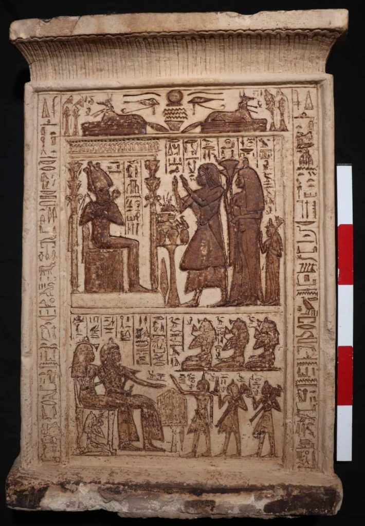 وأوضح أن الصف العلوي من اللوحة يصور المتوفى وزوجته في وضع تعبدي أمام المعبود أوزير والصف السفلي يصور المتوفى جالسا وزوجته خلفه، وتحت مقعد الزوجة مثلت إحدى بناتهما جالسة تقرب إلى أنفها زهرة اللوتس ويزين رأسها بالقمع العطري.