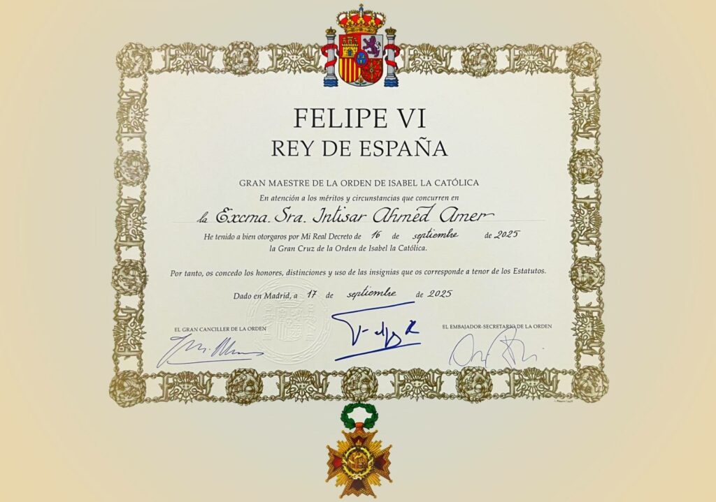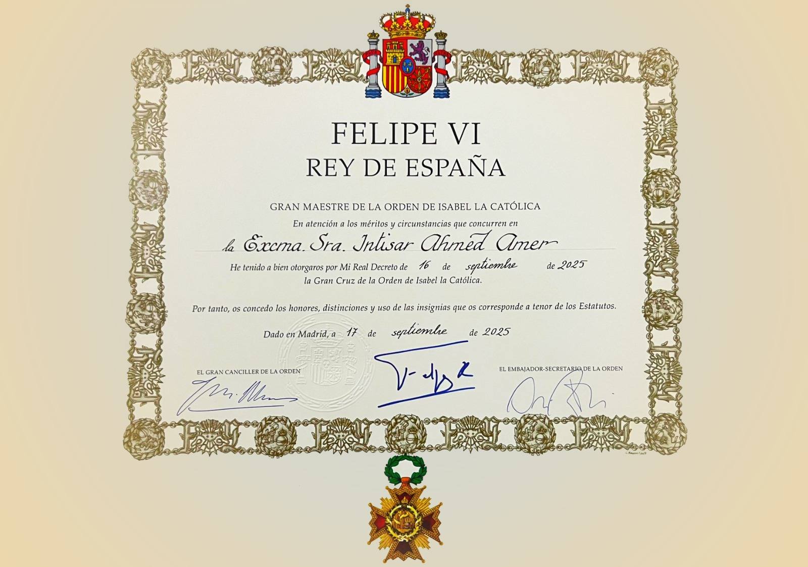 كان ملك إسبانيا فيليبي السادس قد قام بإهداء السيد الرئيس عبد الفتاح السيسي القلادة الملكية لوسام “إيزابيل لاكاتوليكيا”، وكذلك وسام ايزابيل لاكاتوليكيا من طبقة الصليب الأعظم للسيدة انتصار السيسي حرم رئيس الجمهورية.