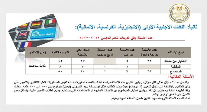 وبالنسبة للغة الأجنبية الاولي( الانجليزية، الفرنسية ، الألمانية) قال الوزير إن الدرجة الكلية ستكون من 50 موزعة 42 درجة للاختبار من متعدد بنسبة 85% ويشمل الامتحان 2 سؤال مقالي لقياس دراسة الطالب للقصة المقرر والمستويات العليا للتفكير والتعبير عن رأي الطالب بالإضافة إلى 4 درجات. حيث يكتب الطالب مقال أو. رسالة بريد إلكتروني يترواح ما بين 150الى 250 كلمة ويكون اختيار الموضوع من الأحداث الجارية أو الاهتمامات التي يستطيع الطالب التعبير عنها وتمتاز بعدم التحيز لأي فئة أو نوع أوديانة أما بالنسبة لاسئلة الترجمة سوف تكون ضمن الأسئلة الموضوعية.