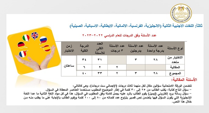 وفيما يخص اللغات الأجنبية الثانية (الإنجليزية، الفرنسية، الألمانية، الإيطالية، الأسبانية، الصينية) قال الدكتور رضا حجازي وزير التربية والتعليم أنها تتضمن الأسئلة المقالية من الورقة الامتحانية سؤالين مقال لكل منهما ثلاث درجات وهي كالتالي: سؤال إنتاج كتابة حيث يكتب الطالب من 25 إلى 30 كلمة في إطار الموضوع المطلوب مستخدمًا العناصر المعطاة في السؤال، وسؤال رسالة بريد إلكتروني (إيميل)، ويقوم الطالب بالرد عليه بجمل كاملة وفق المطلوب في السؤال، هذا في كل مواد اللغة الثانية ما عدا اللغة الإنجليزية التي يكون السؤال فيها يتضمن نص قصير يتراوح عدد كلماته من 80 إلى 100 كلمة ويقوم الطالب بالإجابة على ما يطلب منه من خلال هذا النص.