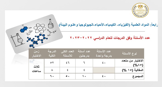 وبالنسبة للمواد العلمية (الفيزياء- الكيمياء-الأحياء-الجيولوجيا وعلوم البيئة) تشتمل على أسئلة الاختيار من متعدد 85 % ، والمقالية 15 % ، وكذلك بالنسبة للمواد الأدبية (التاريخ- الجغرافيا- علم النفس – والاجتماع- الفلسفة)، و الرياضيات بفروعها المختلفة.