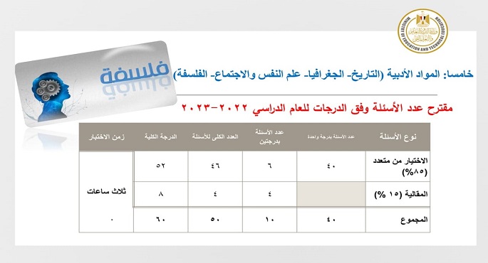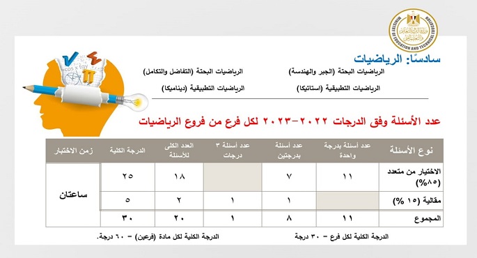 وأضاف أنه بالنسبة لمادة اللغة العربية ستكون الدرجة الكلية من 80 موزعة 68 درجة للاختبار من متعدد، و12 درجة للاسئلة المقالية ومدة الامتحان 3 ساعات.. موضحا أن الامتحان سيتضمن ٤ اسئلة مقالية تمثل درجتها. 15% منها سؤال تعبير بست درجات و3 اسئلة كل سؤال بدرجتين سوف توزع على فروع المادة وسوف تتضمن اسئلة القراءة الادبية سؤالا من القصة المقررة.