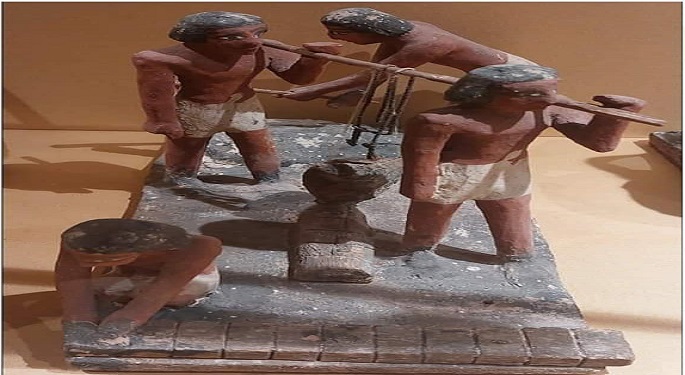 نموذج مصنوع من الخشب لمخزن للغلال من الدولة الوسطي، بداخله أربعة أشخاص، يحمل أحداهم كيس الحبوب بينما اثنين آخرين يقومان بتخزين الحبوب في الصومعة، بينما يجلس الكاتب يمسك بيده قلم ولوحة الكتابة يسجل بها كميات الحبوب التي يتم تخزينها أو إصدارها.