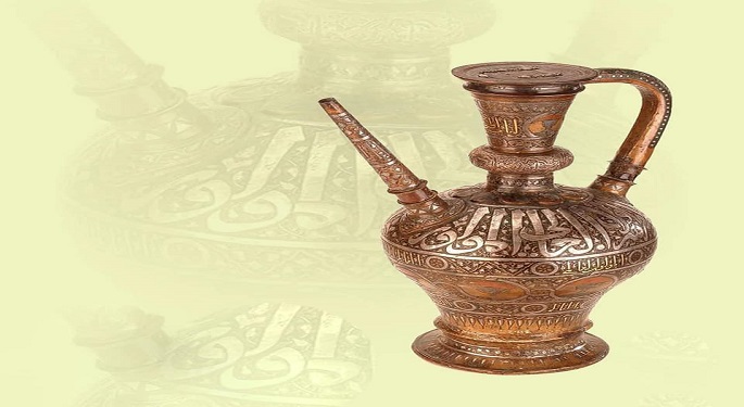 يعرض أبريق من النحاس المكفت بالذهب والفضة حيث كانت صناعة المعادن في العصر الإسلامي من الصناعات الهامة التي استطاع الفنان والعامل المصري إدخال تقنيات جديدة للصناعة أبرزت الفن الإسلامي بكل عناصره.