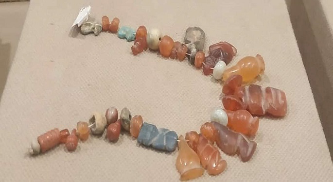 يعرض أسورة من العقيق والزجاج مكونة من مجموعة من الخرزات المختلفة الأشكال والأحجام، يتخللها بعض الخرزات من اليشب الأحمر، وبعض التمائم من العقيق واللازورد، وتميمتان على شكل عين الأوجات. كما يوجد بها بعض الدلايات على شكل ثمرة الرمان، وبعض الخرزات من الزجاج منظومة فى خيط حديث.